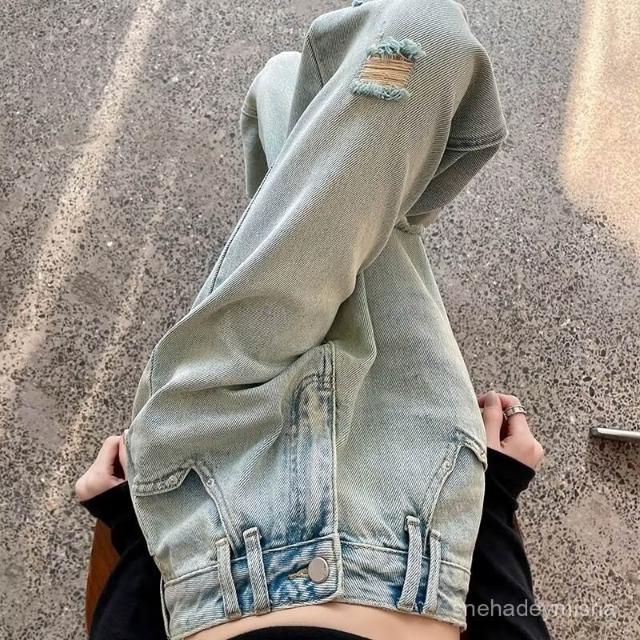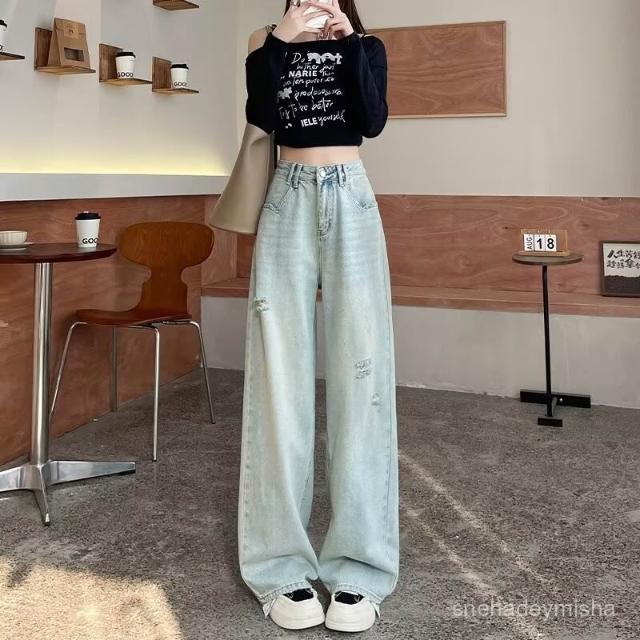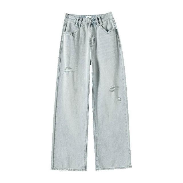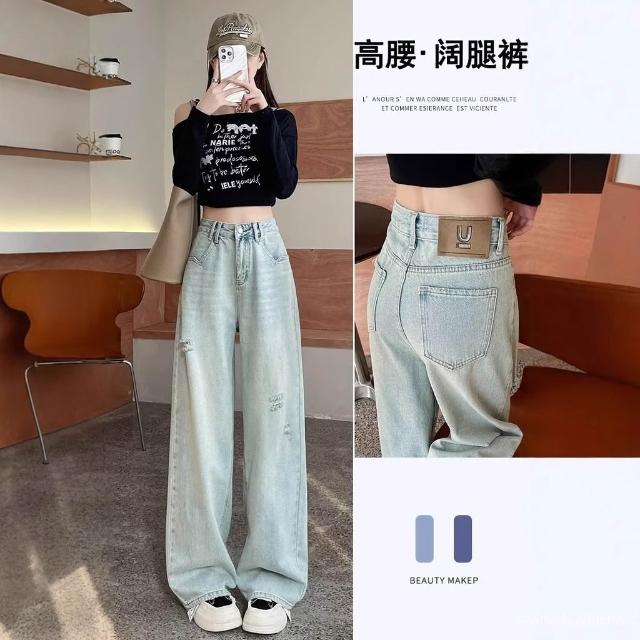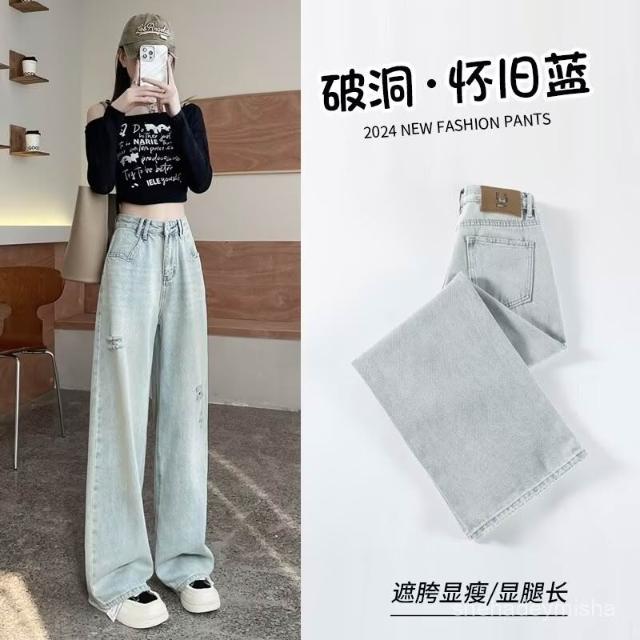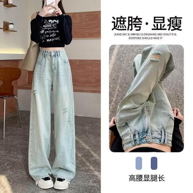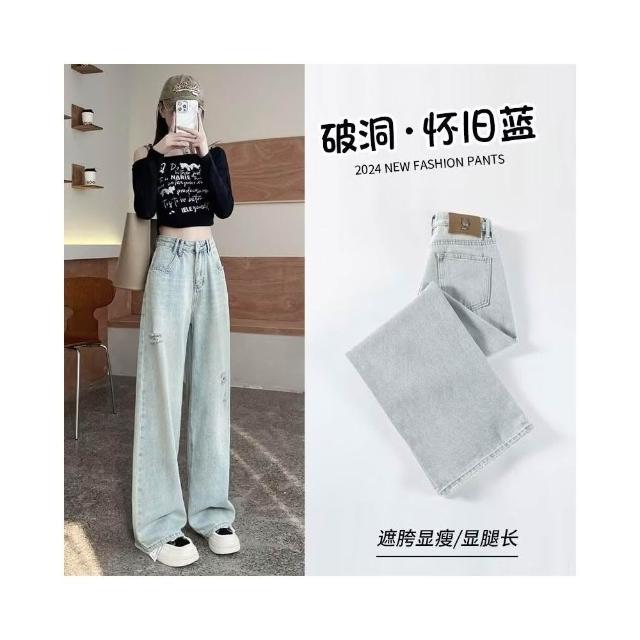 兜兜服飾破洞直筒牛仔褲 女秋季新款 高腰寬鬆美式窄版闊腿拖地褲子