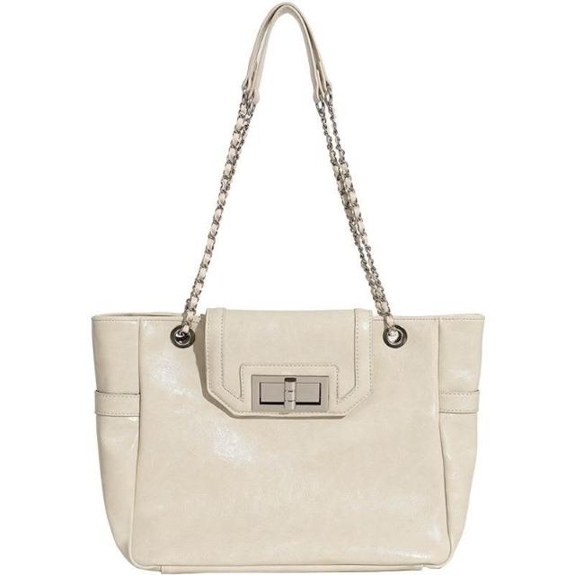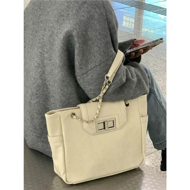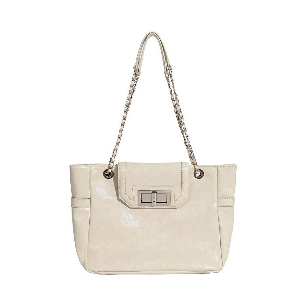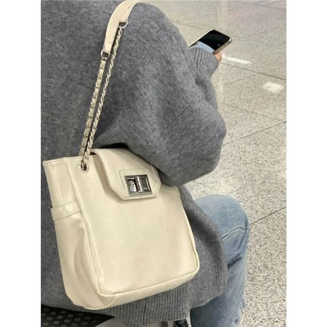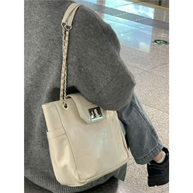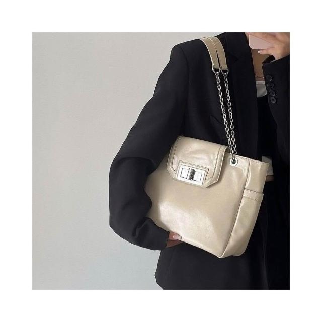 兜兜服饰韓系小挎包 復古油蠟皮大容量托特包 大鎖釦腋下包 鏈條單肩包水桶包