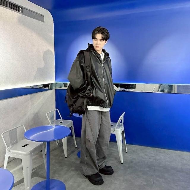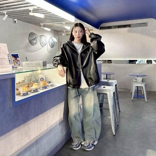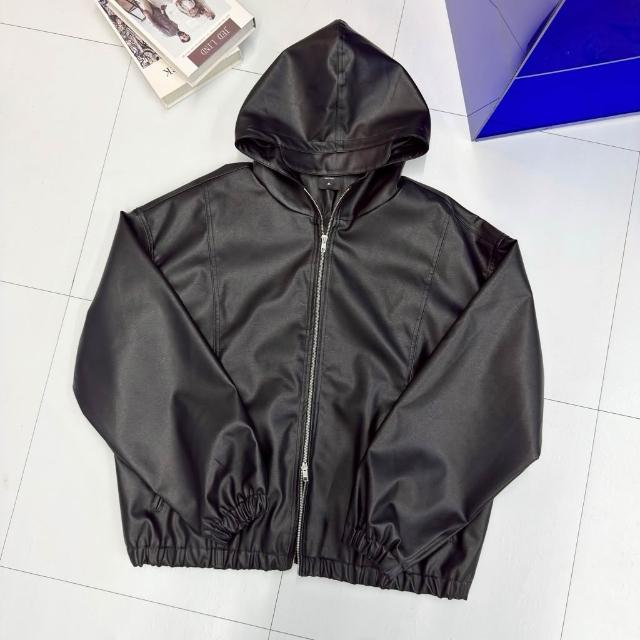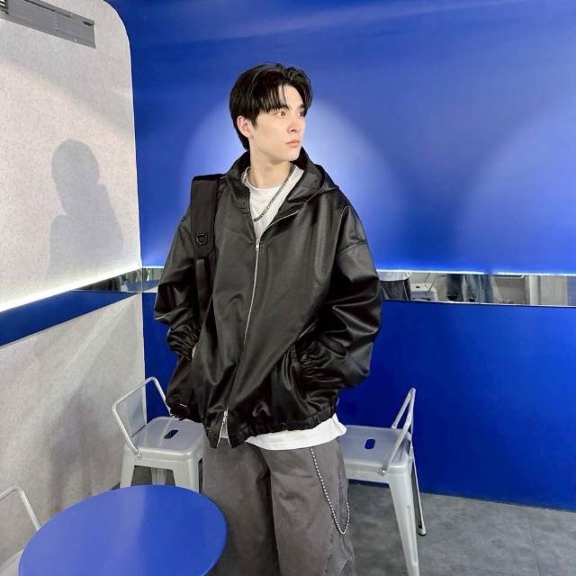 韓國 美式 廓形 連帽 素面 皮革 皮衣 皮外套 雙拉鍊 束口 設計 潮流 百搭 情侶 連帽外套 夾克 外套
