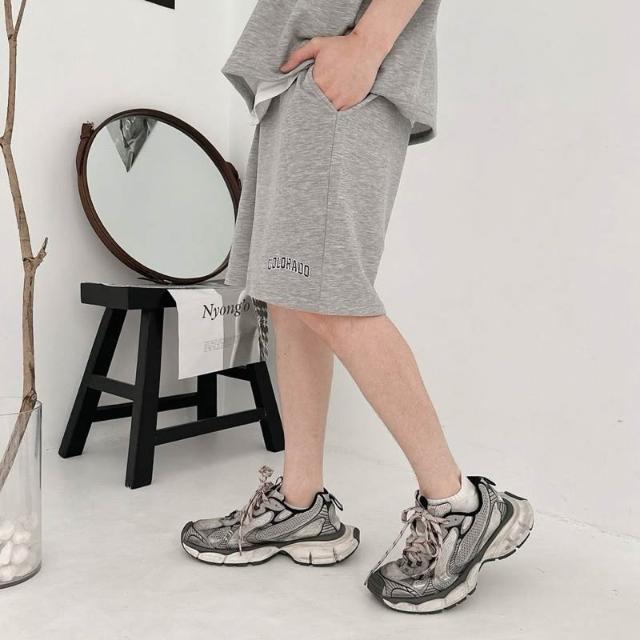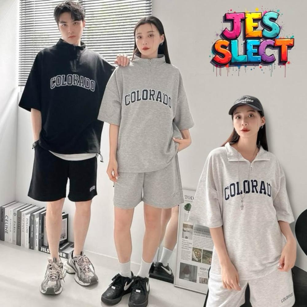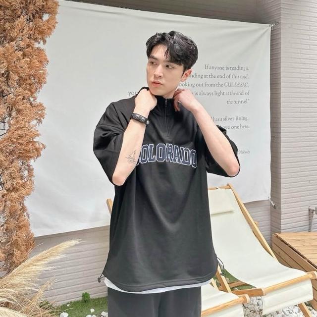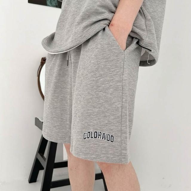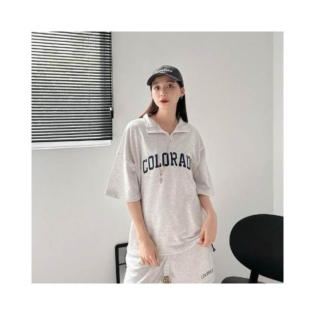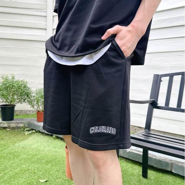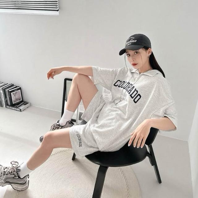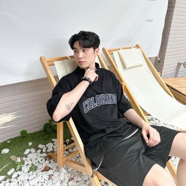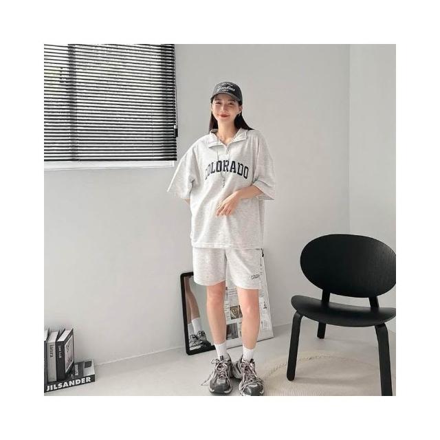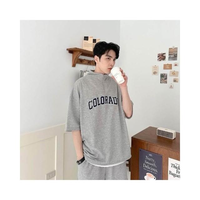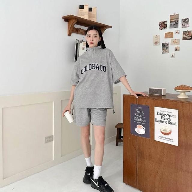 韓國 套裝 美式 拉鍊領 半拉鍊 字母 刺繡 彈性 親膚 透氣 時尚 潮流 情侶 短袖 短褲 短T 套裝組