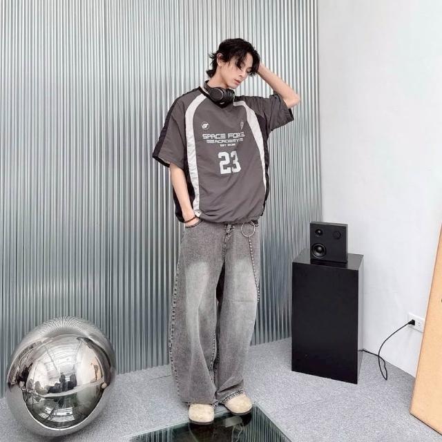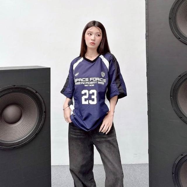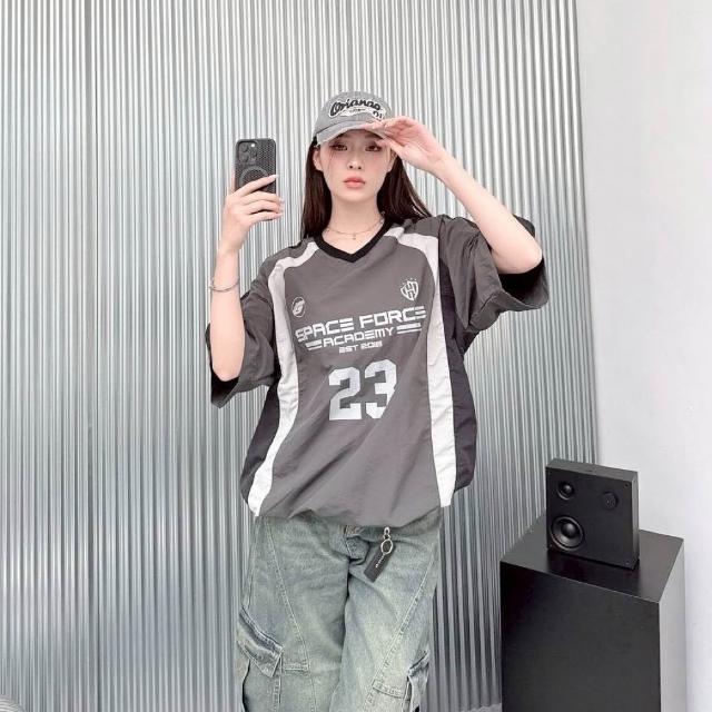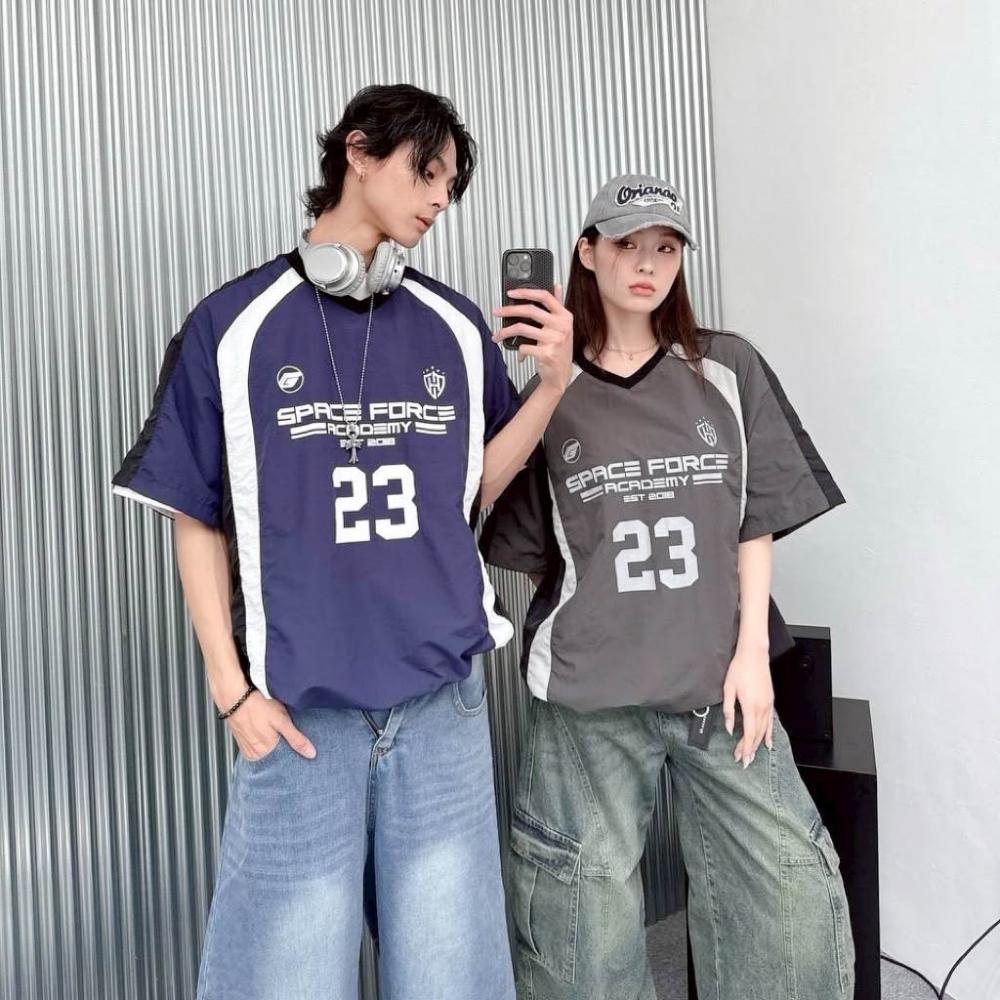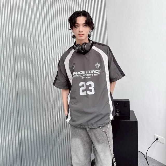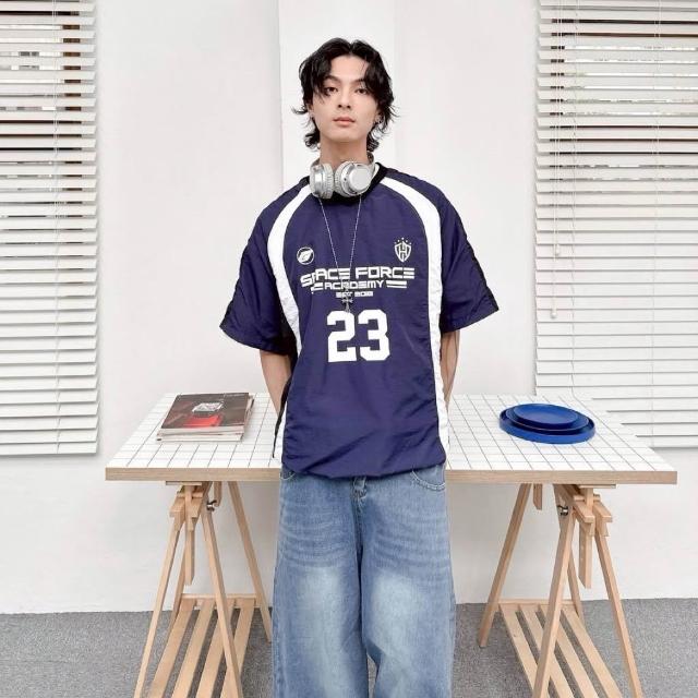 JES韓國 美式 賽車風 拼接 拼色 撞色 號碼 字母 徽章 印花 街頭 個性 潮流 百搭 情侶 短T 束口 風衣