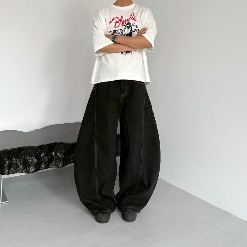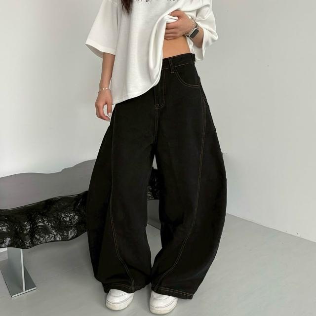 JES韓國 後排扣 造型 原色 牛仔 彎刀褲 彎刀 車線 版型 剪裁 潮流 百搭 闊腿 落地褲 寬褲 牛仔長褲 長褲