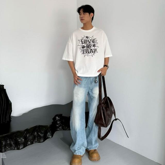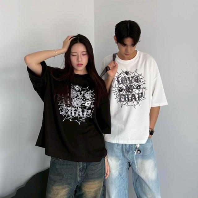 JES韓國 美式 Boxy 短寬 短版 版型 蜘蛛網 字母 插圖 印花 個性 街頭 潮流 百搭 短版 短袖 短T