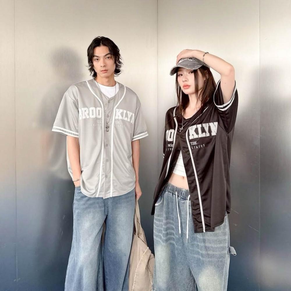 JES美式 球衣風 Brooklyn 字母 刺繡 街頭 潮流 百搭 情侶 棒球風 短袖 上衣 襯衫 罩衫