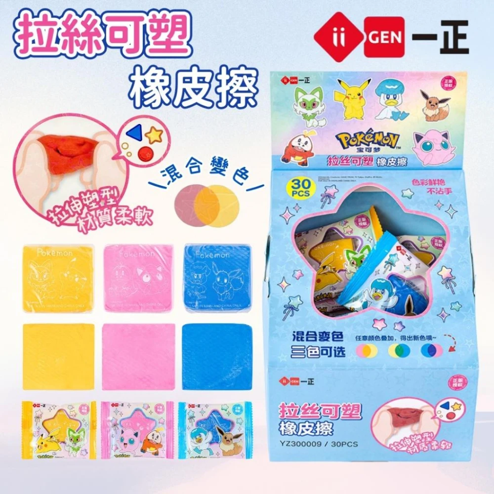 ✨台灣秒發+開發票🚀一正 寶可夢拉絲可塑橡皮擦 正版授權 擦拭乾淨 黏土橡皮擦 混合變色 不沾手 修正橡皮擦