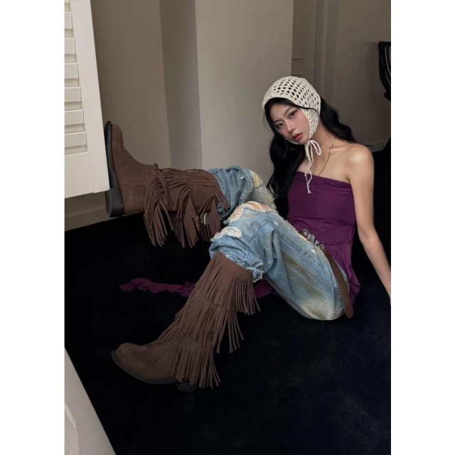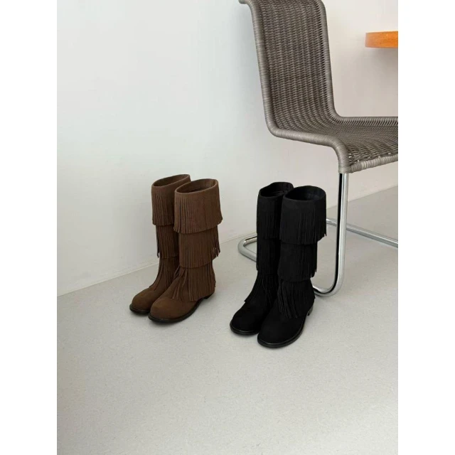 👢真皮麂皮3層流蘇低跟中靴長靴・復古感造型靴款|韓國代購直播款・全館免運〃HITOMI〃