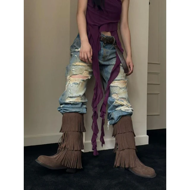 👢真皮麂皮3層流蘇低跟中靴長靴・復古感造型靴款|韓國代購直播款・全館免運〃HITOMI〃