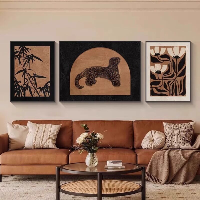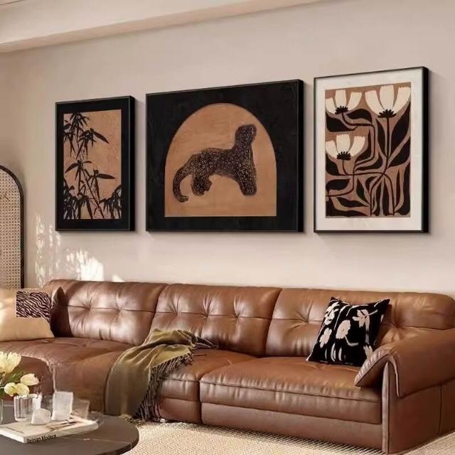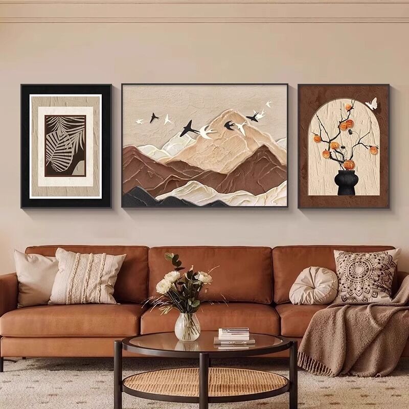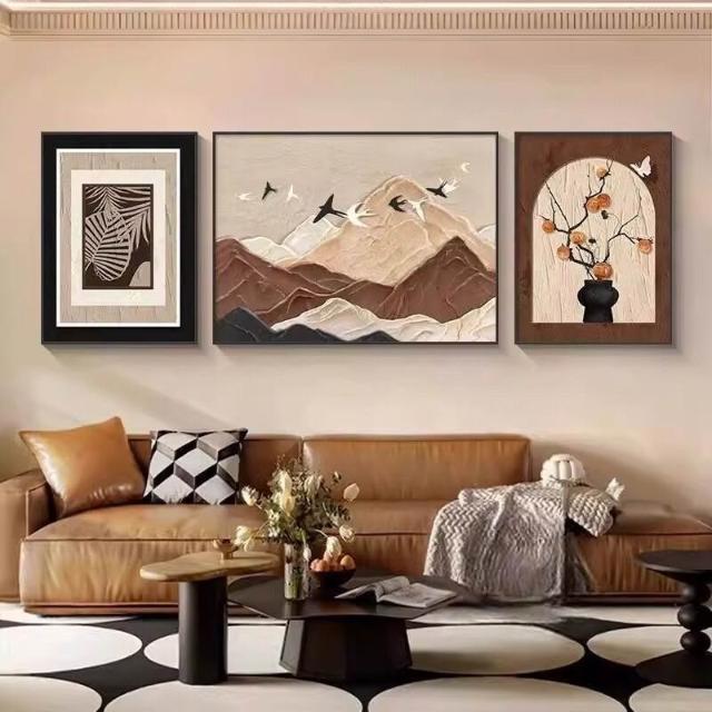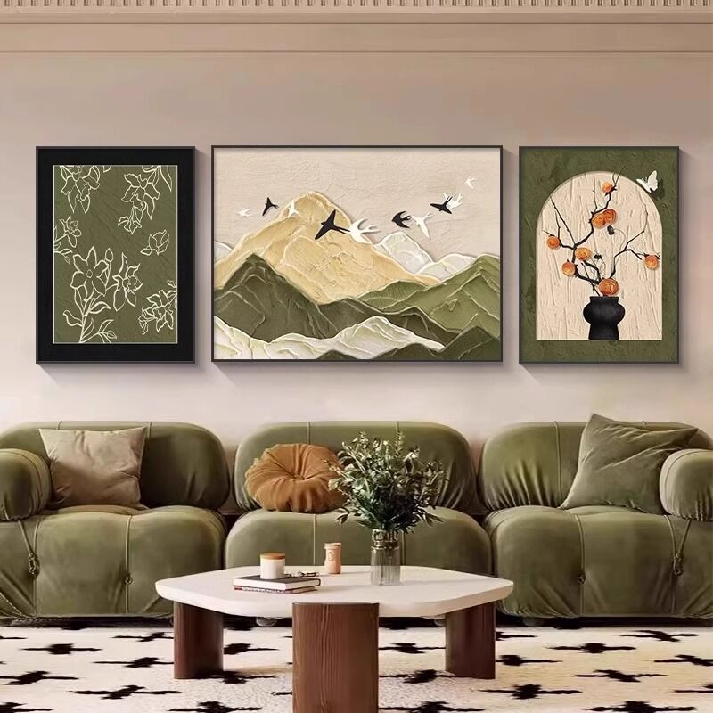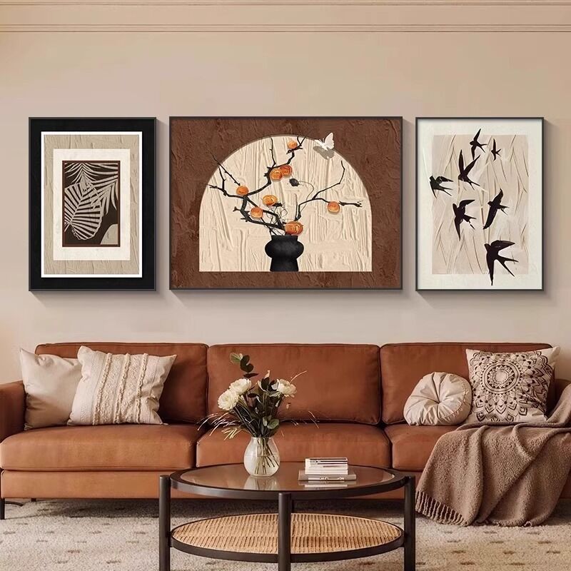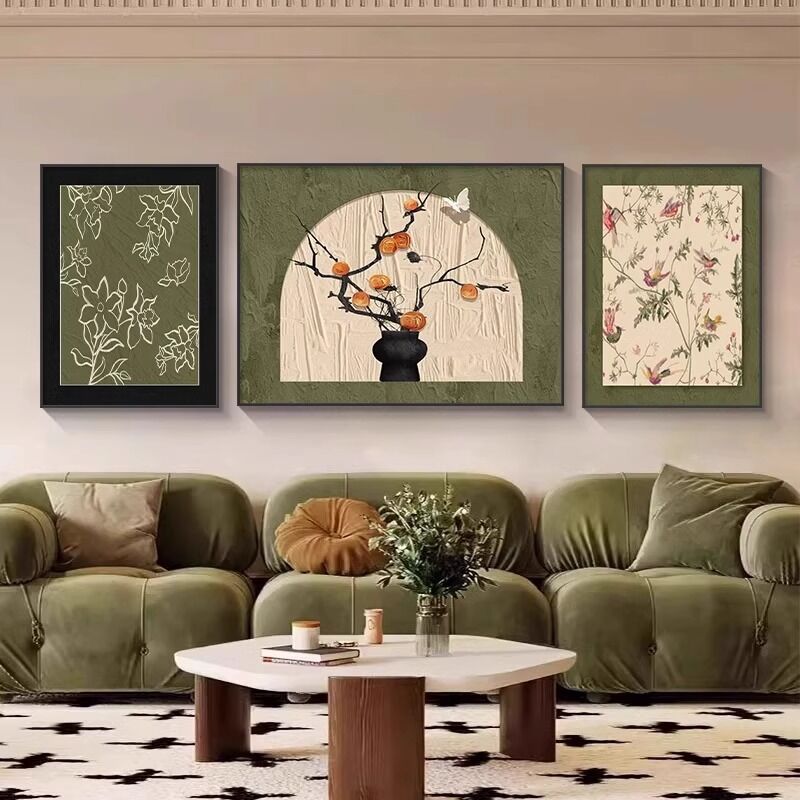 中古風客廳柿柿如意裝飾畫高級感沙發背景墻掛畫復古藝術三聯壁畫