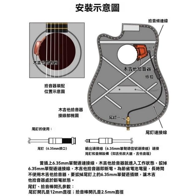 Guita GGP-01 木吉他免打孔雙模拾音器(雙重拾音|音孔安裝|6.35mm輸出)|柚子樂器