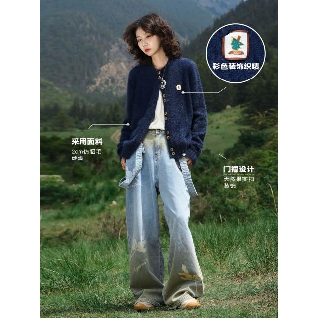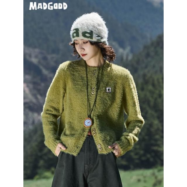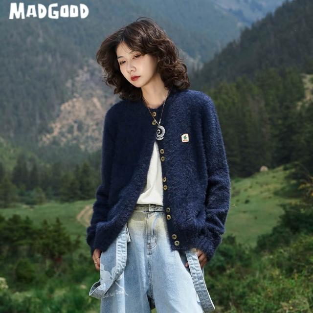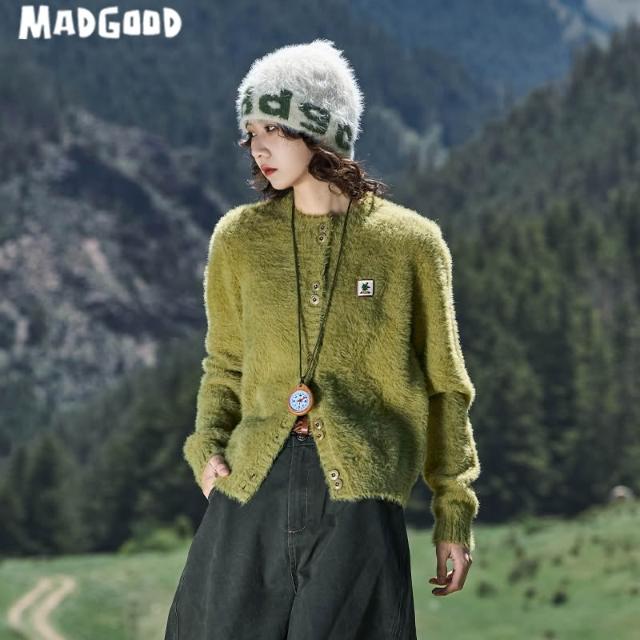 madgood馬得工地日系百搭春秋款仿貂毛正肩logo圓領開衫外套