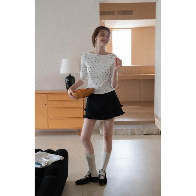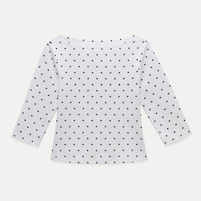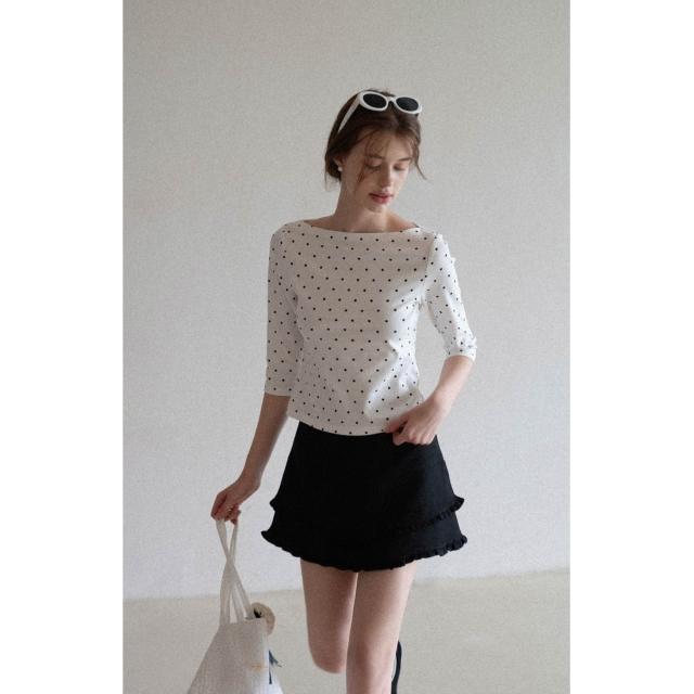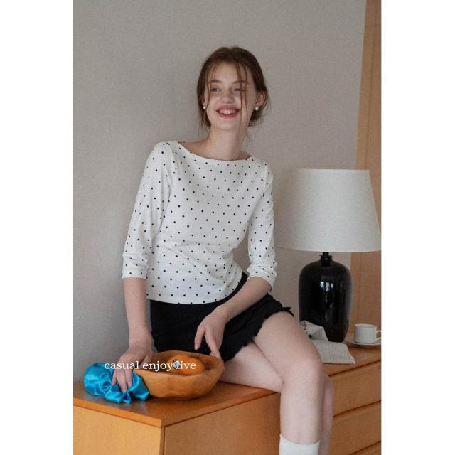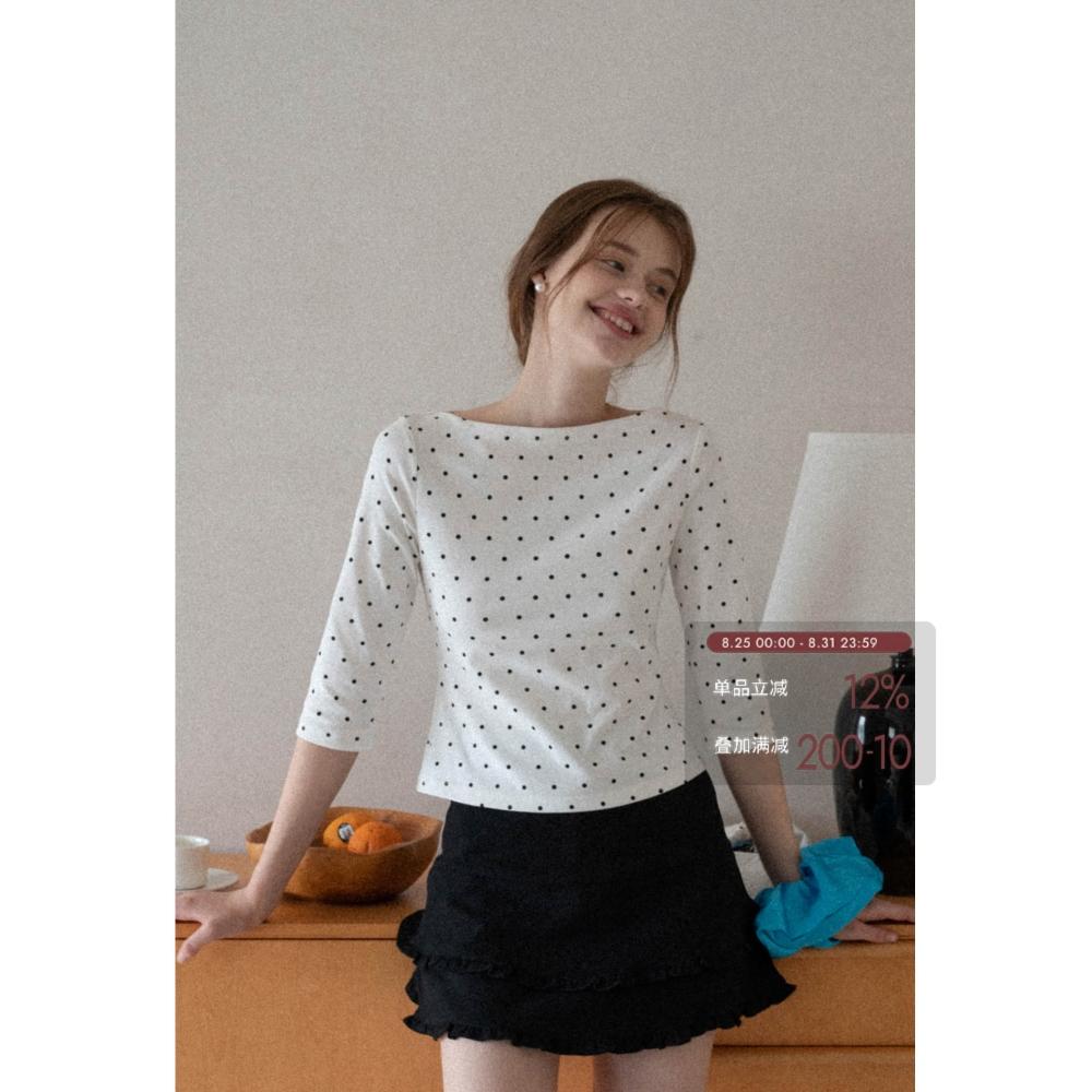 波點白色七分袖T恤女早秋一字領正肩氣質顯瘦休閒通勤上衣