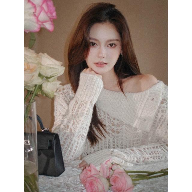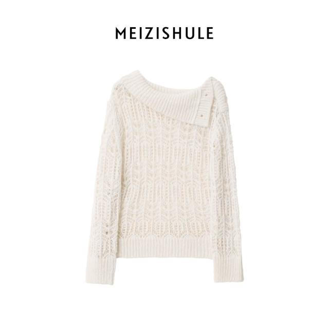 法式鏤空絞花翻領斜肩白色毛衣女早秋寬鬆軟糯慵懶風上衣