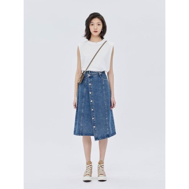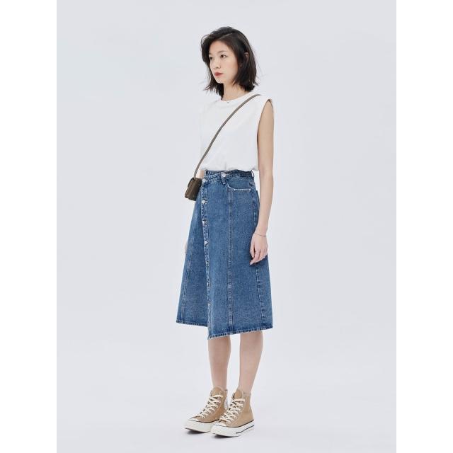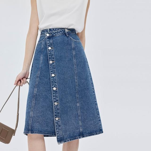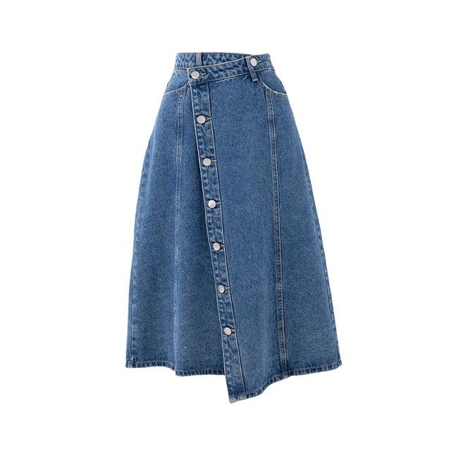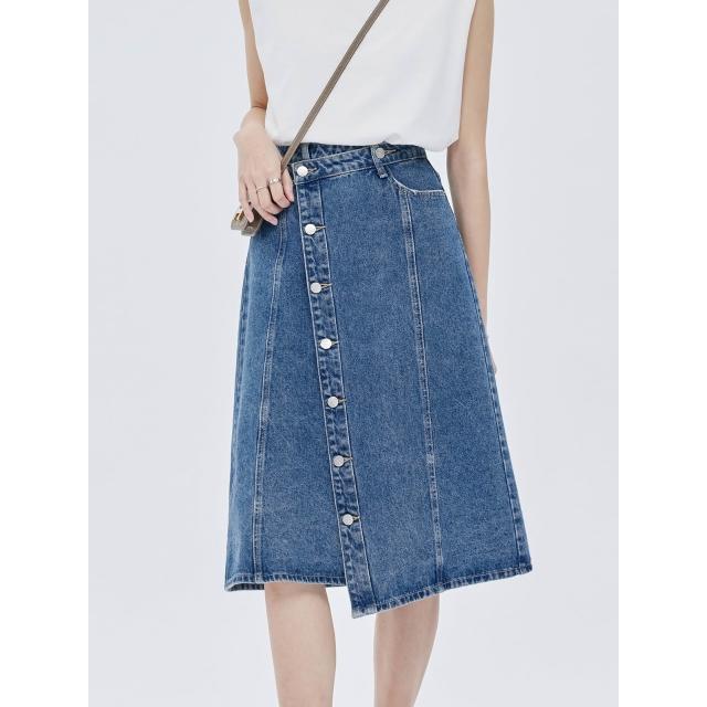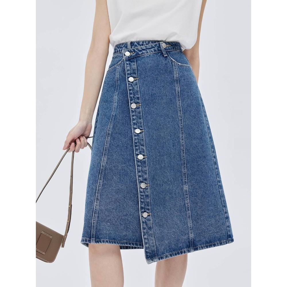 不規則排扣拼接一片式中長款復古2025新款夏季高腰a字牛仔短裙