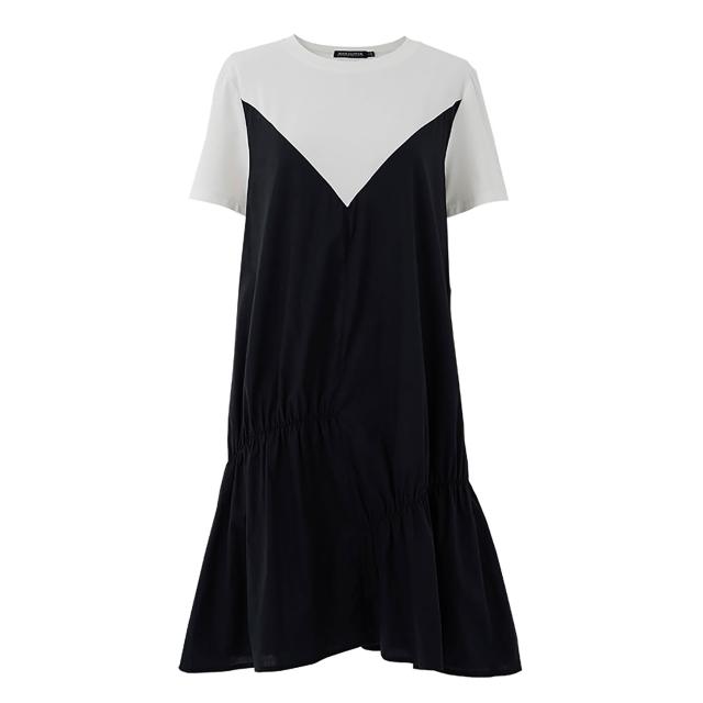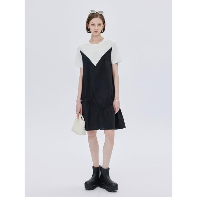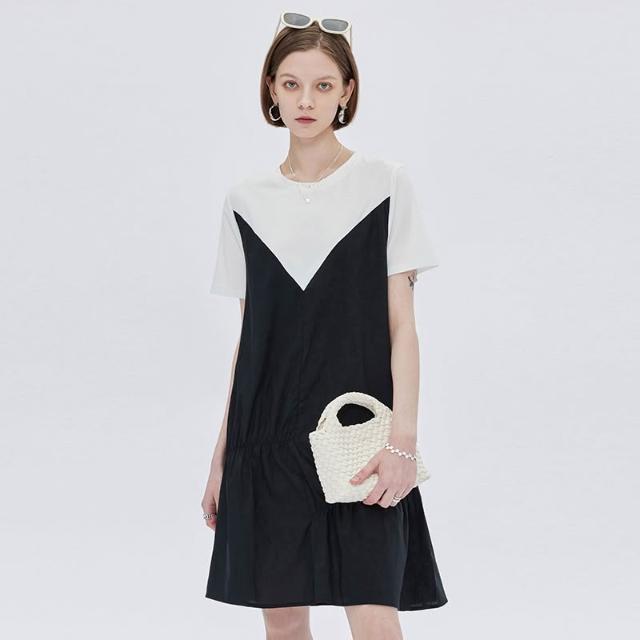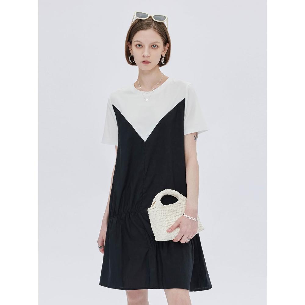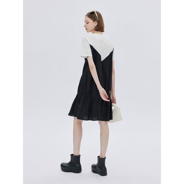 假兩件針織黑白拼接t恤裙中裙2025夏季趣味少女風圓領短袖洋裝