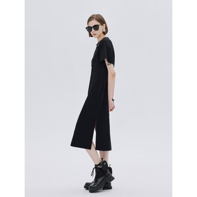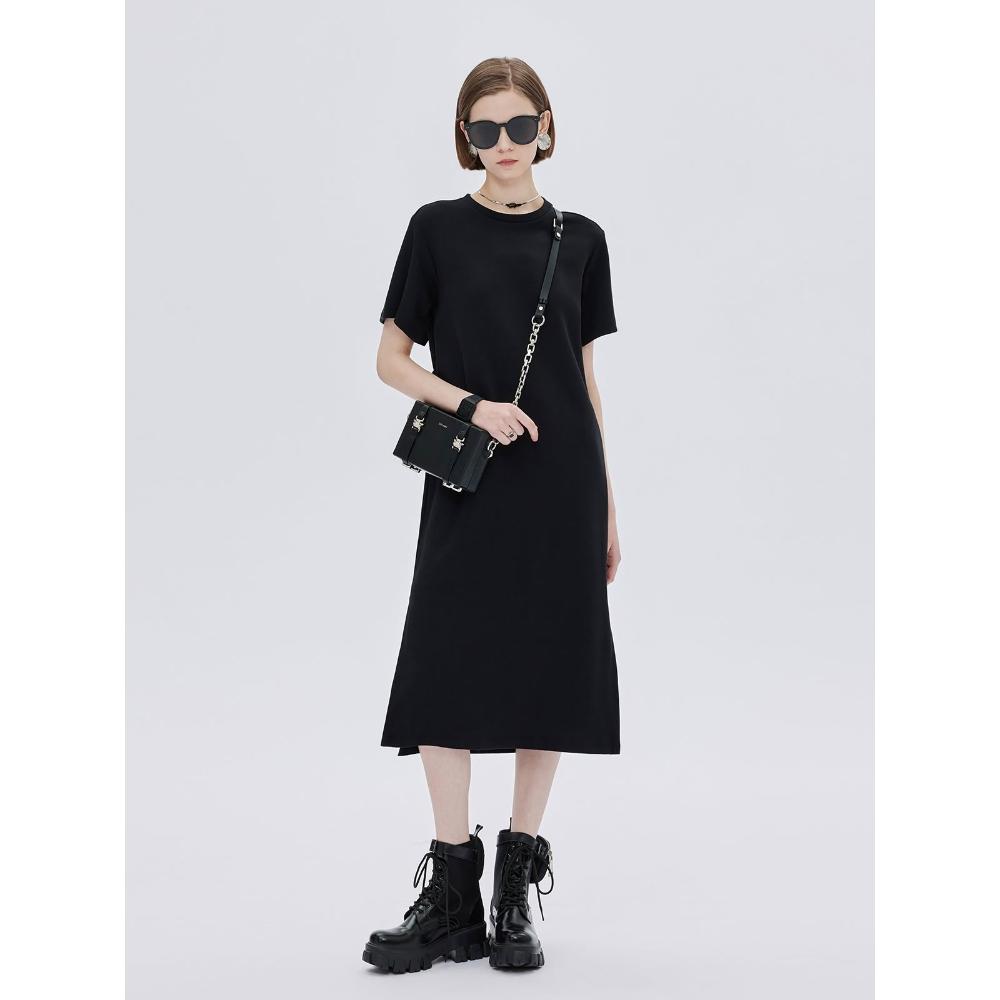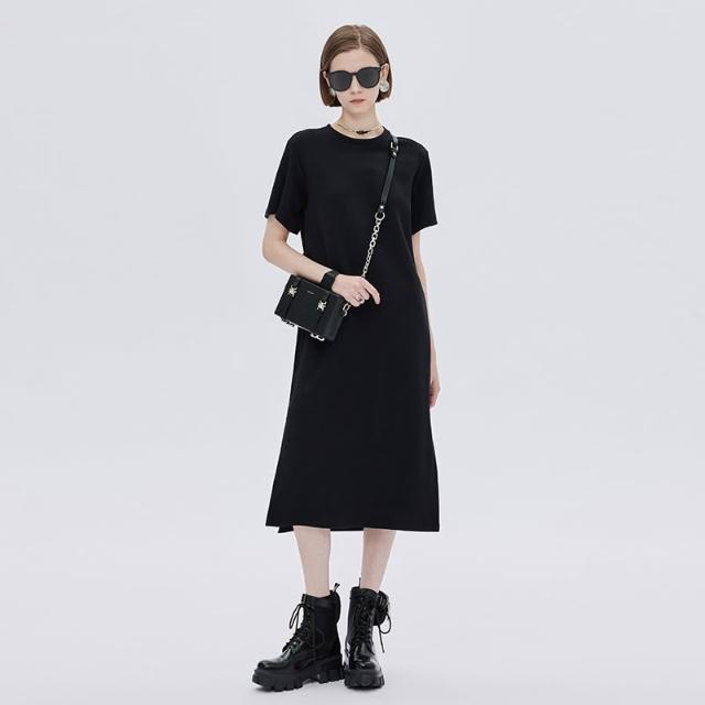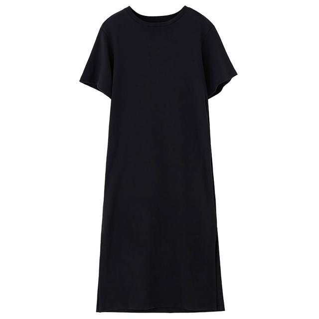 甜酷風開叉彈力口袋T恤黑裙2025高級感夏季中長款寬鬆短袖洋裝