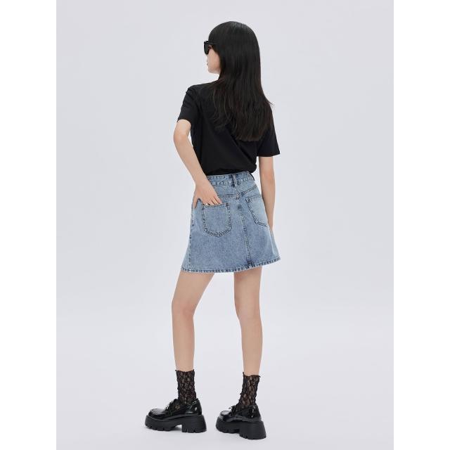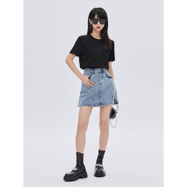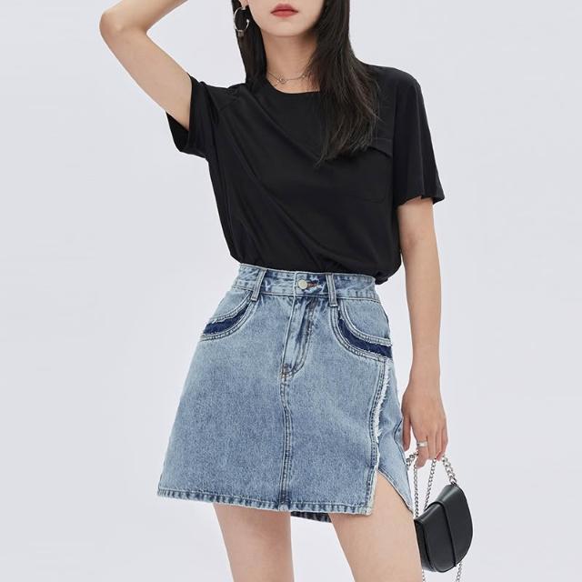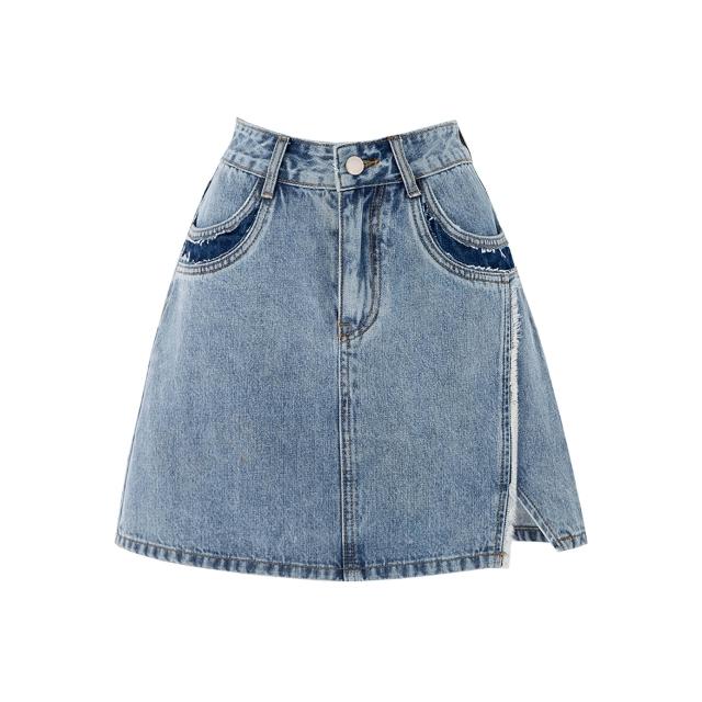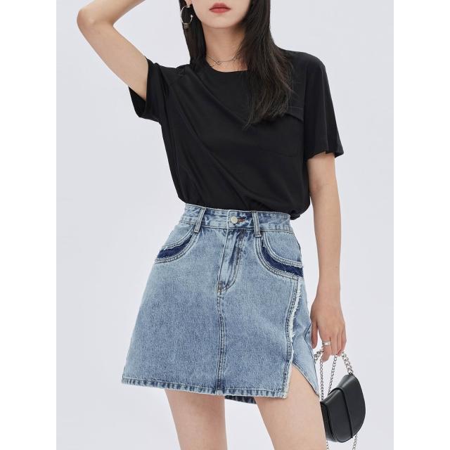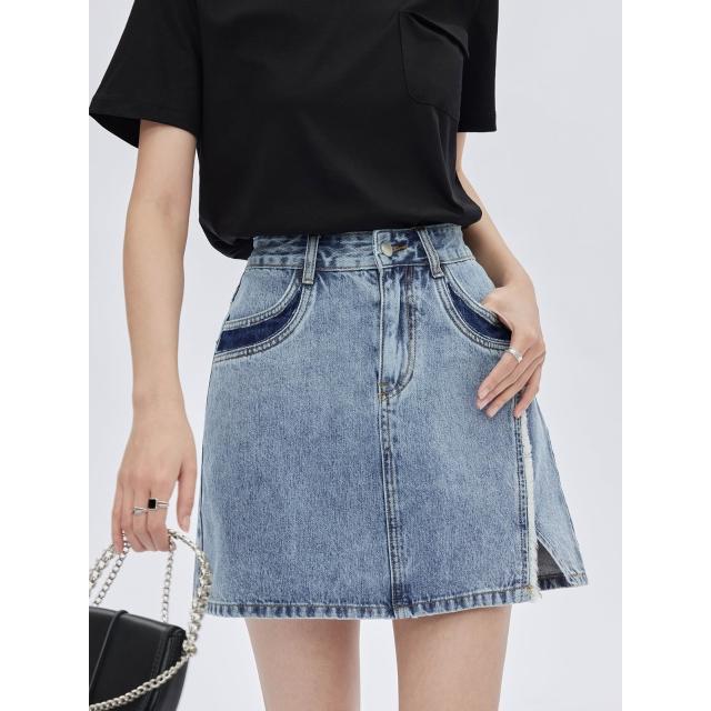 不對稱撞色拼接開叉毛邊短裙2025年夏復古高腰a字牛仔短裙新款
