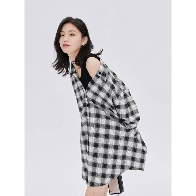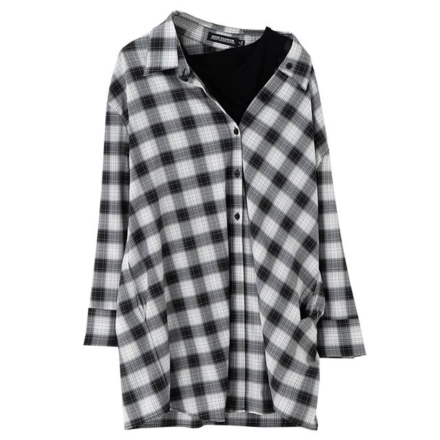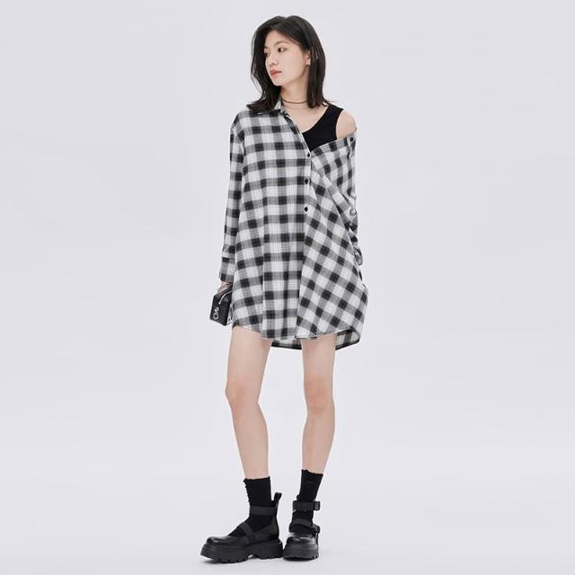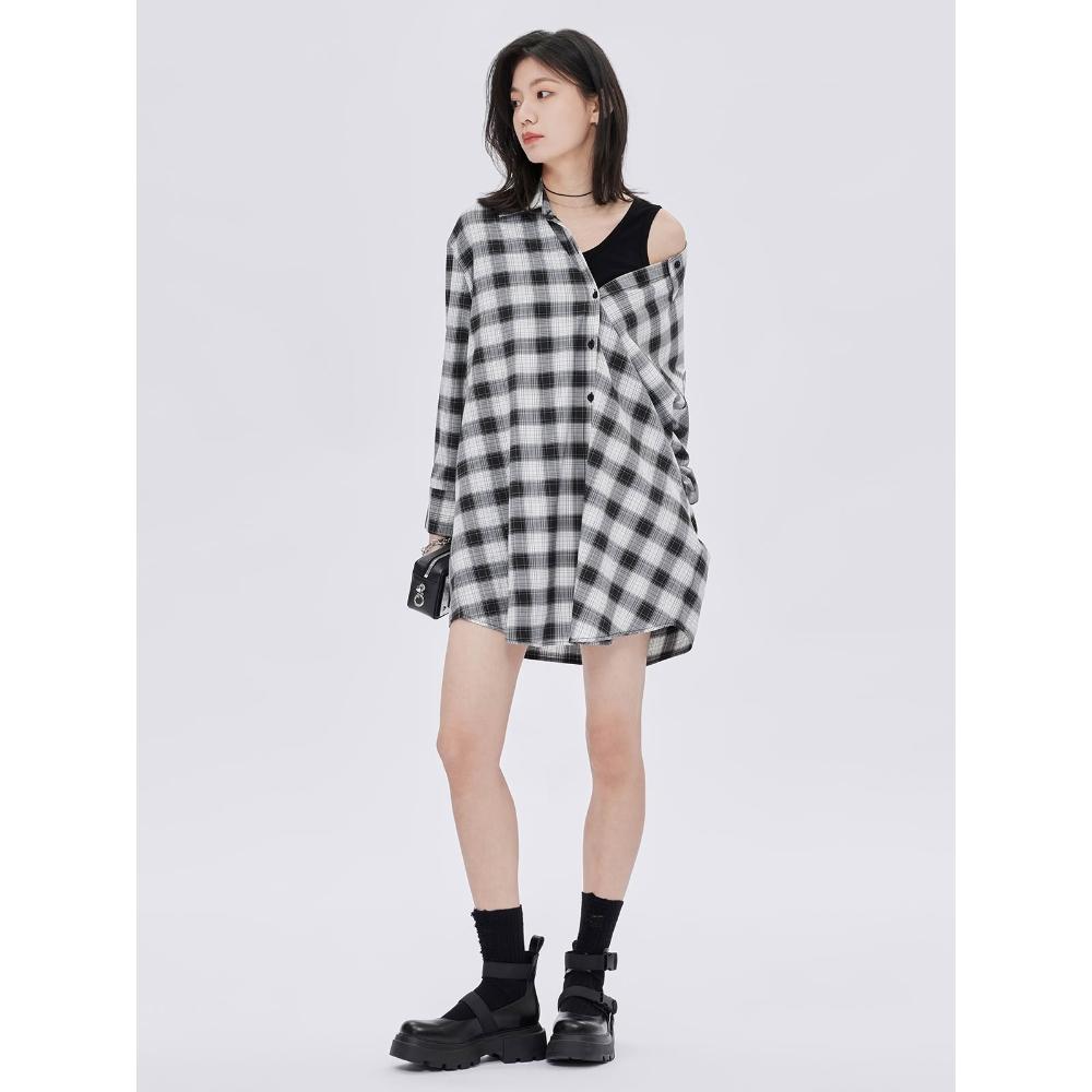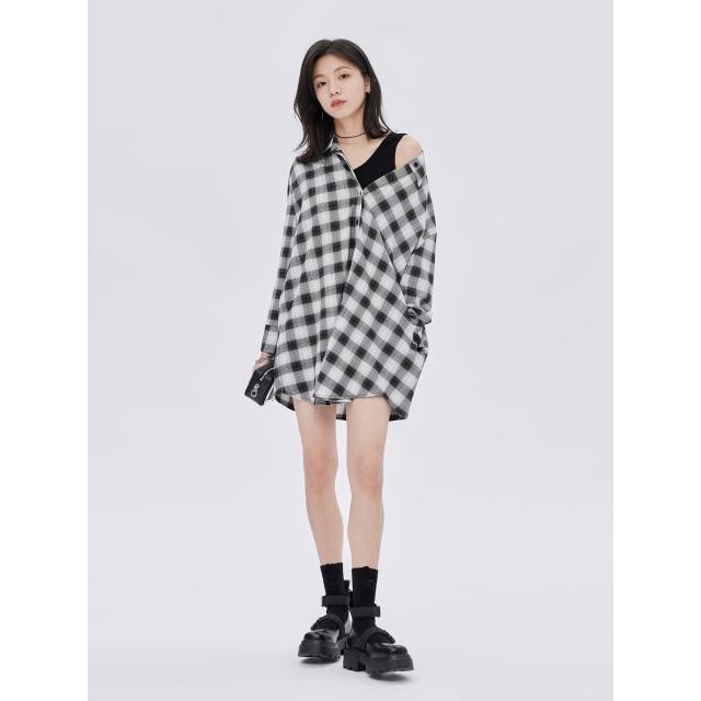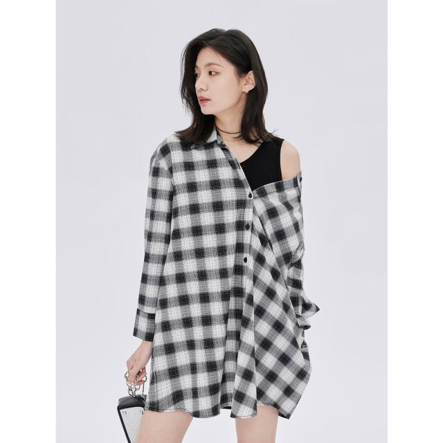 假兩件露肩拼接黑白格襯衫裙解構風遮肚子減齡寬鬆顯瘦長袖洋裝