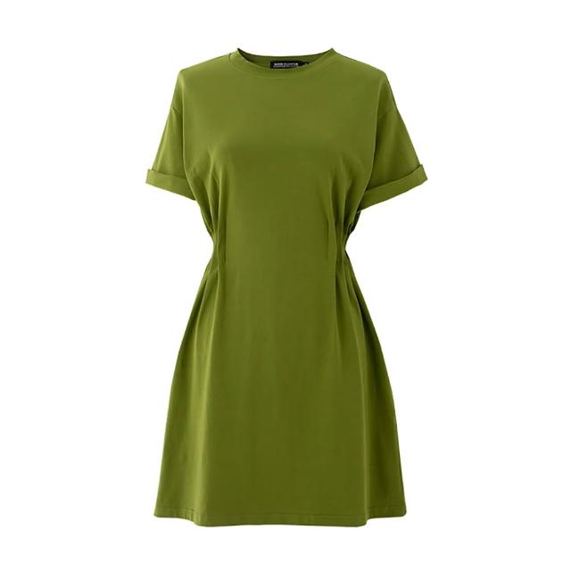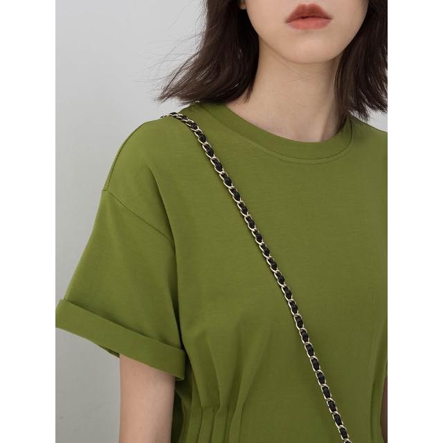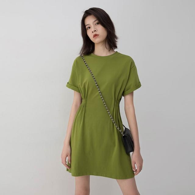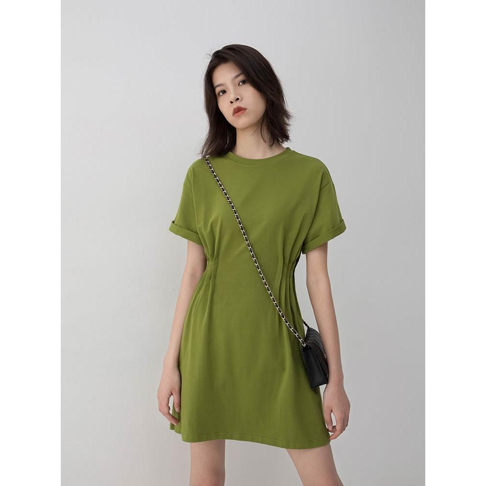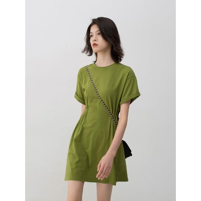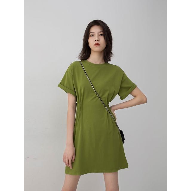 落肩袖薄款綠色收腰T恤裙爆款流行彈力別緻洋裝設計感小衆夏季