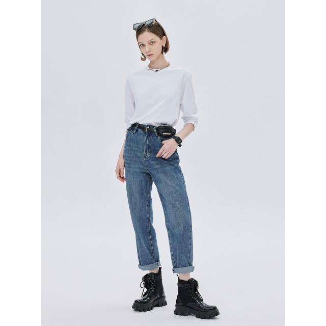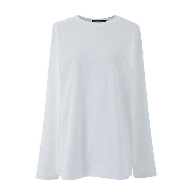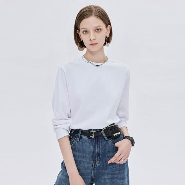 中性風休閒落肩純棉上衣2025新款百搭秋季直筒白色圓領長袖t恤女