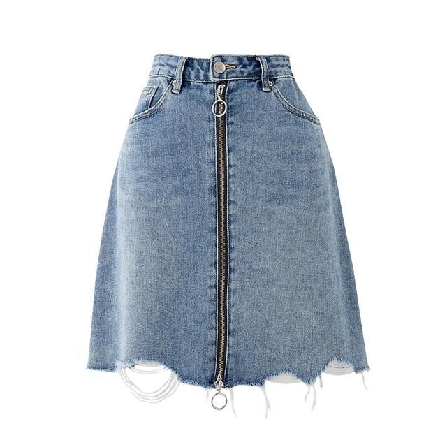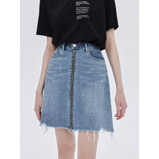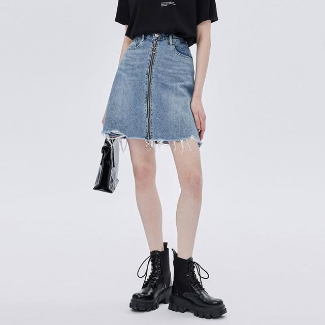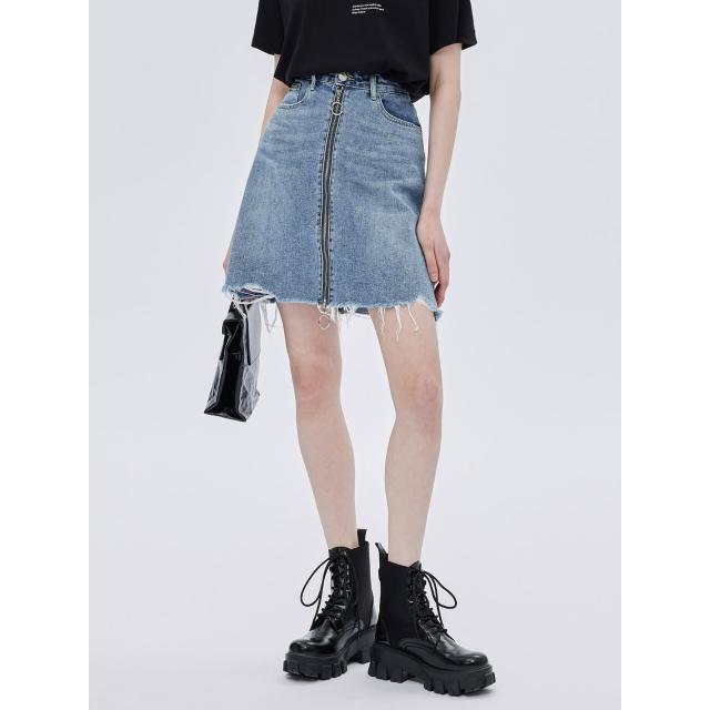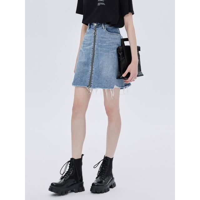 不規則毛邊拉鍊頭一片式短裙設計師款春秋季藍色高腰a字牛仔短裙