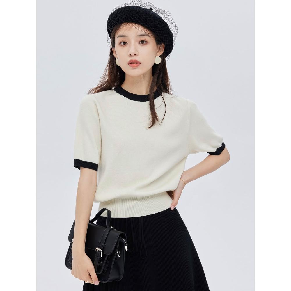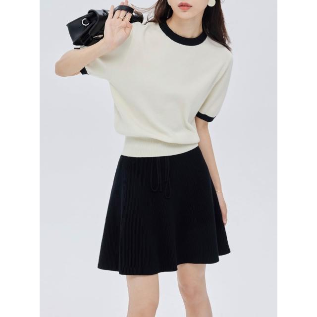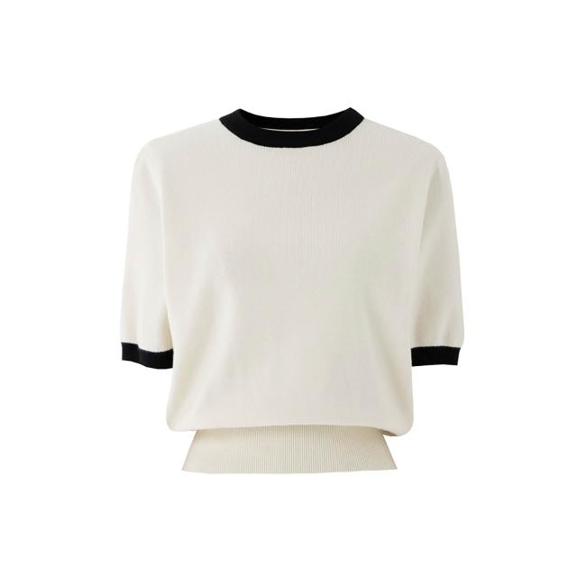 韓系chic別緻上衣2025新款拼色收腰螺紋圓領套頭夏季針織毛衣女短袖