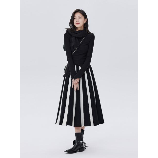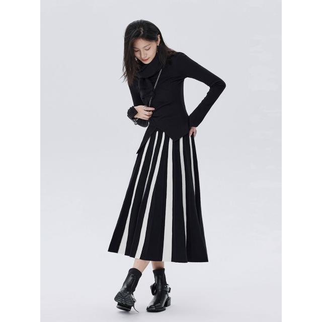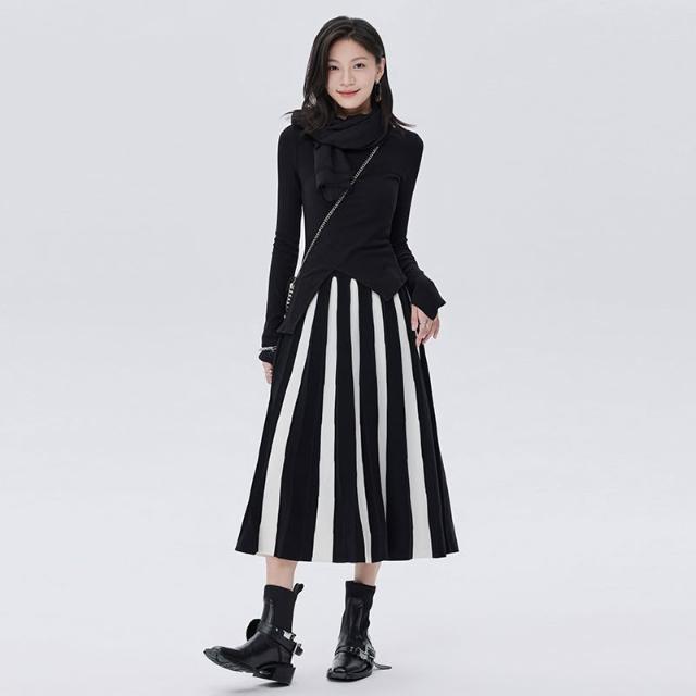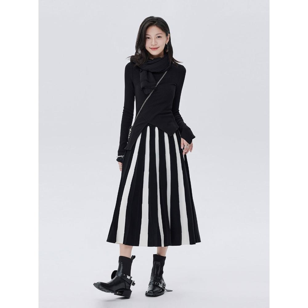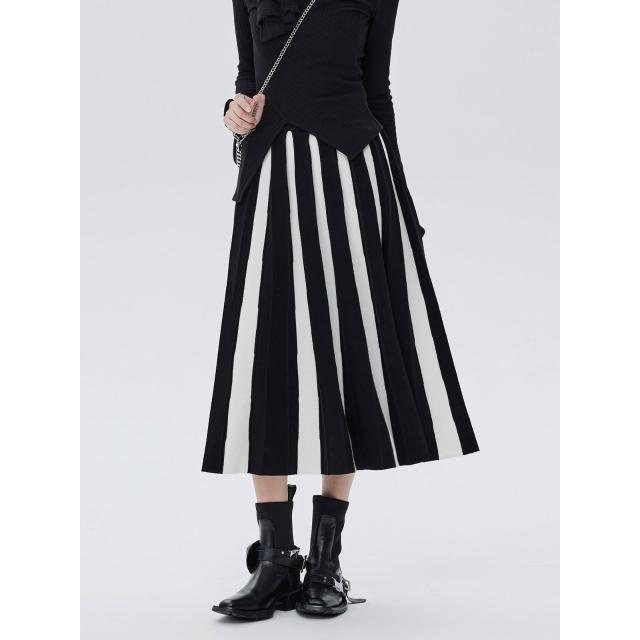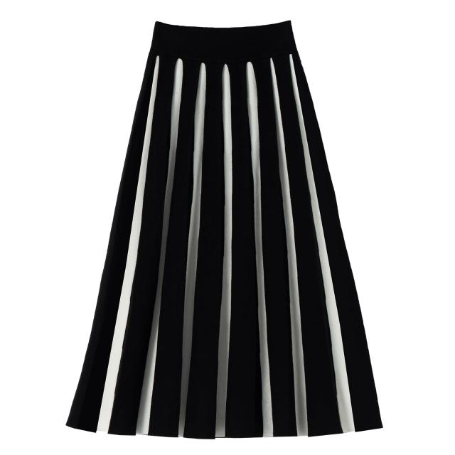 鬆緊腰百褶高腰傘裙彈力2025新款秋季黑白條紋中長款針織短裙女