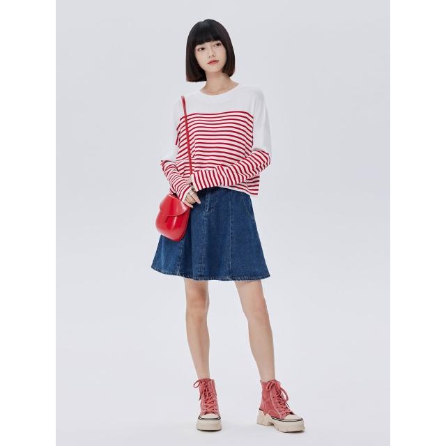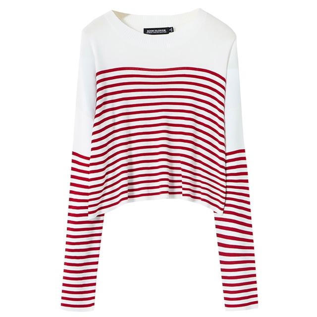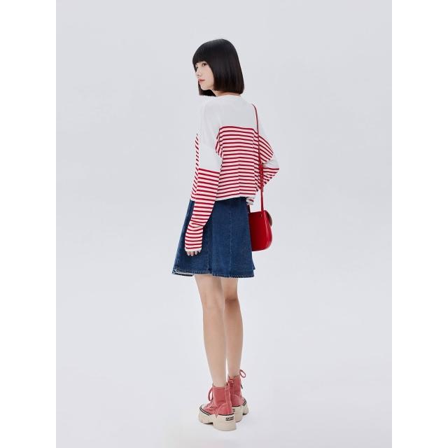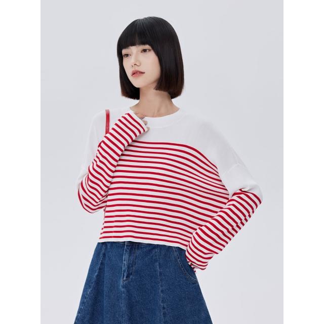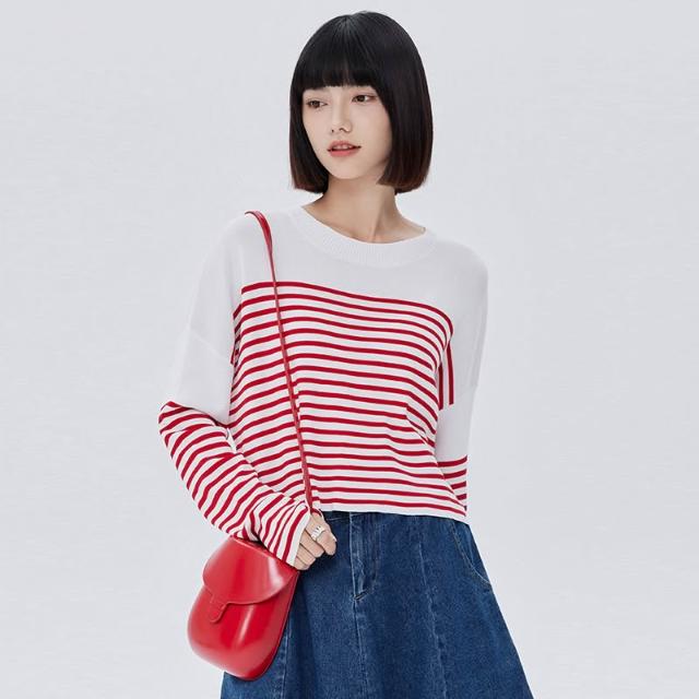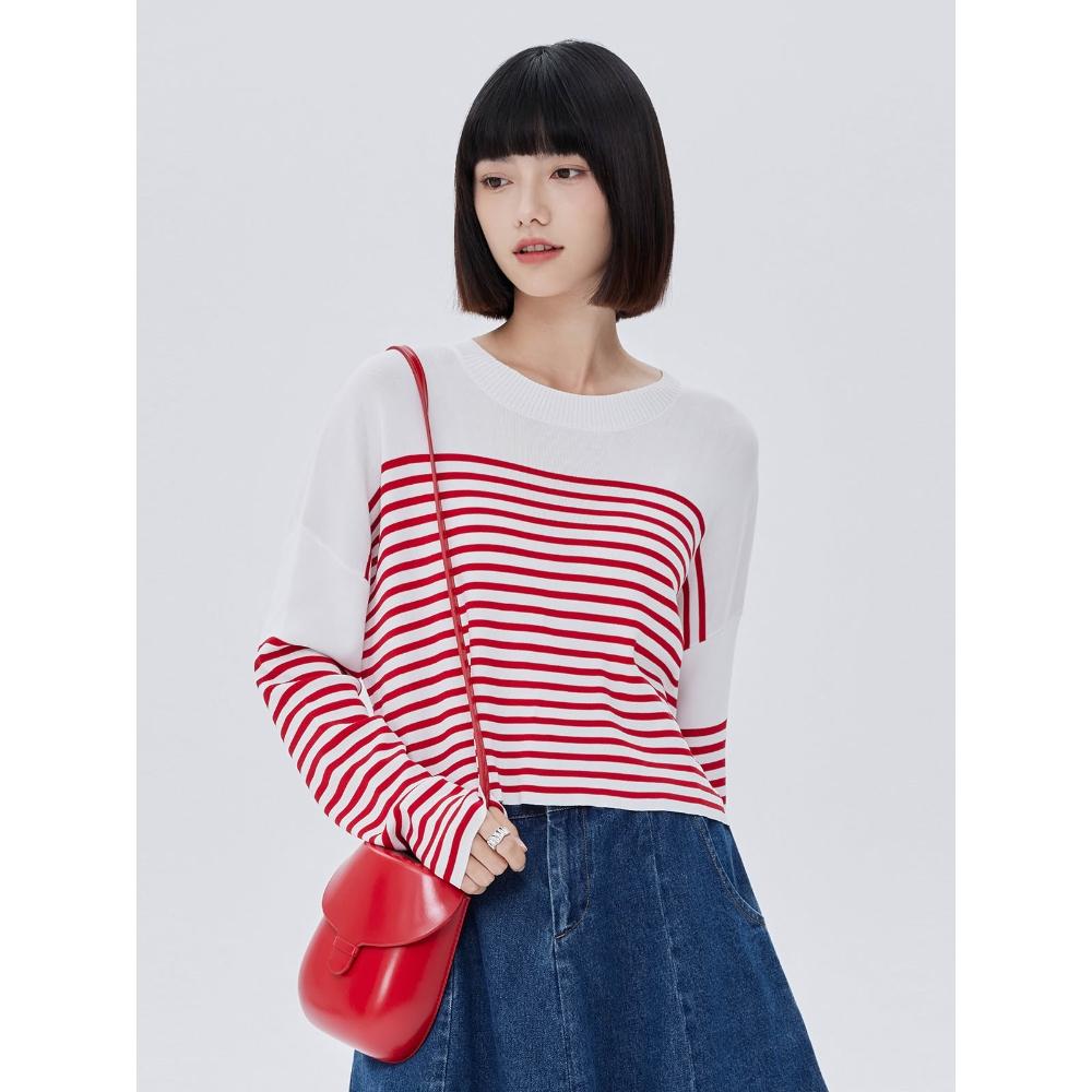 撞色條紋蝙蝠袖寬鬆慵懶風2025新款秋季紅色長袖圓領針織上衣女