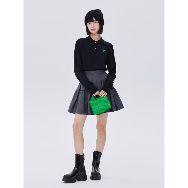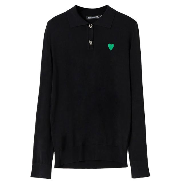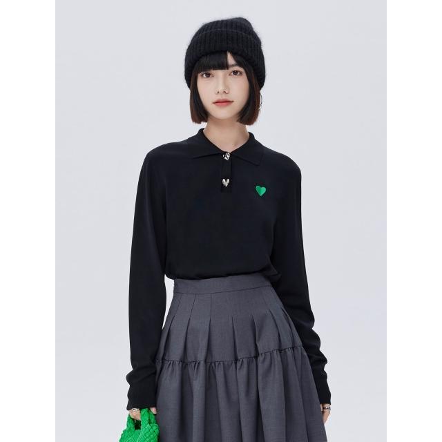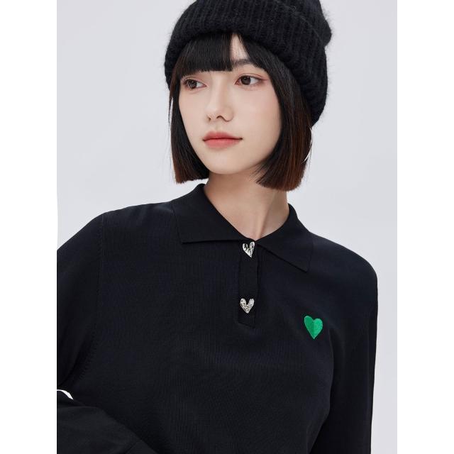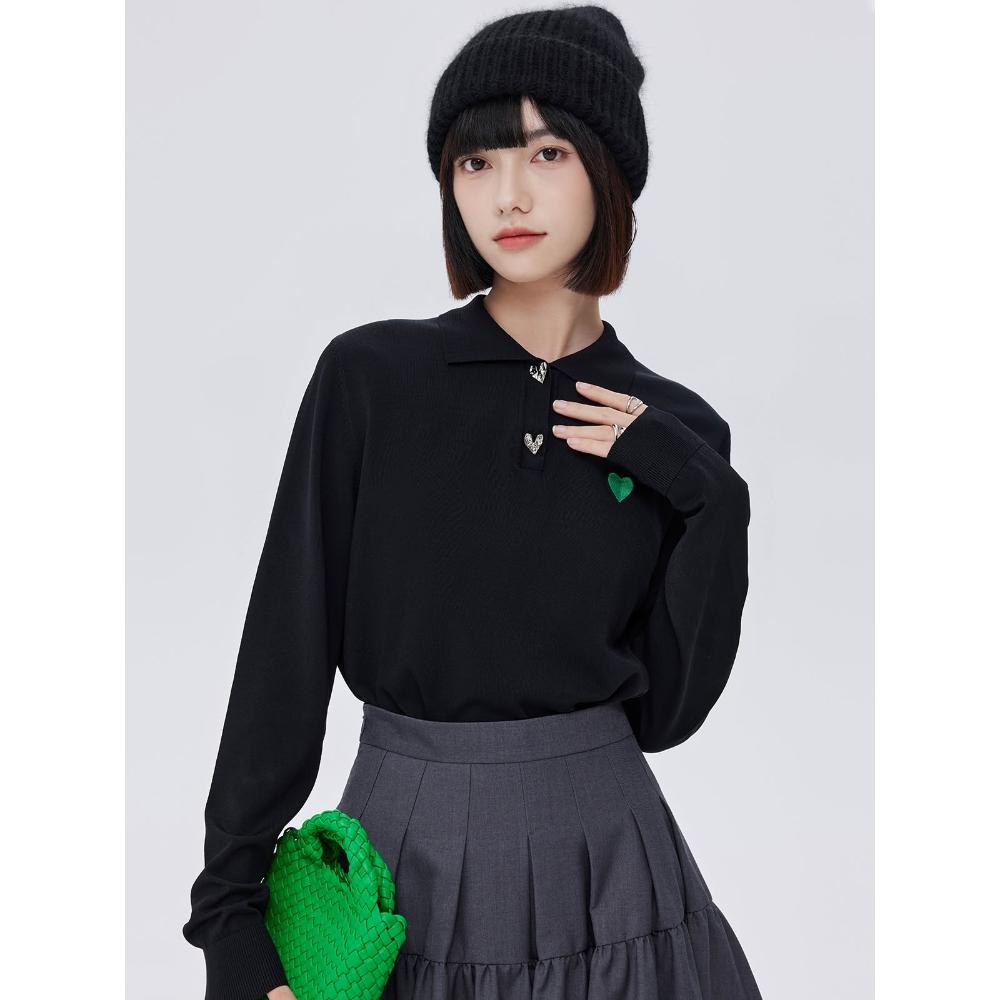 翻領愛心刺繡鈕釦polo衫2025新款秋螺紋黑色套頭長袖針織上衣女
