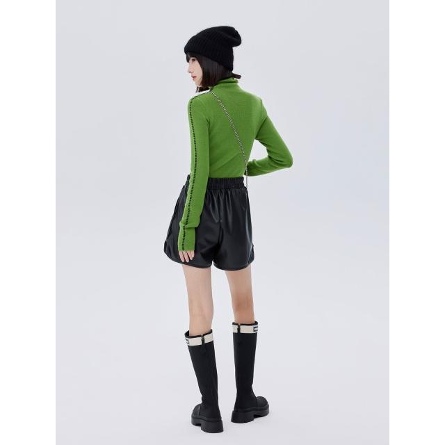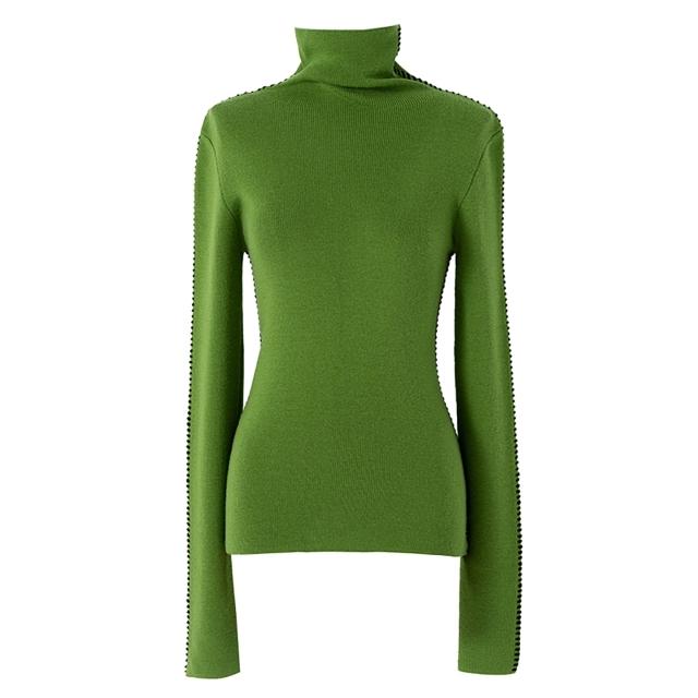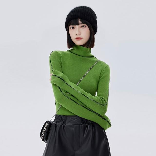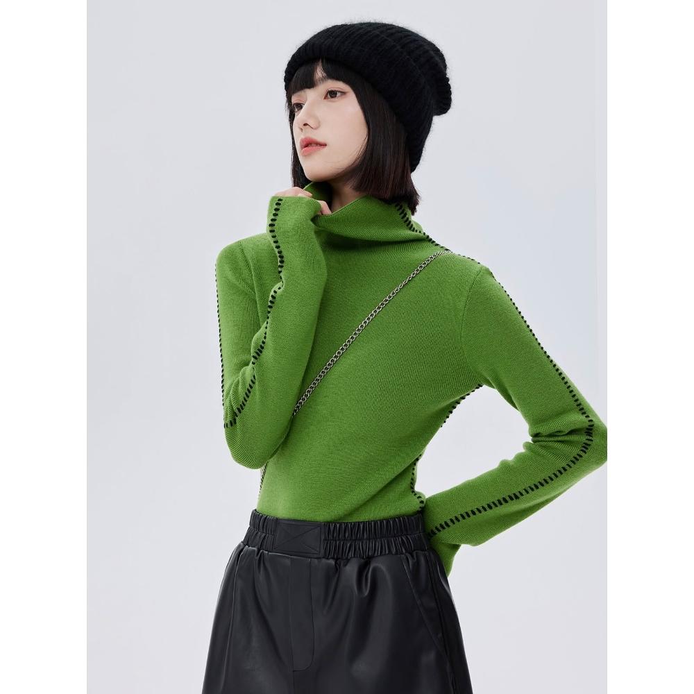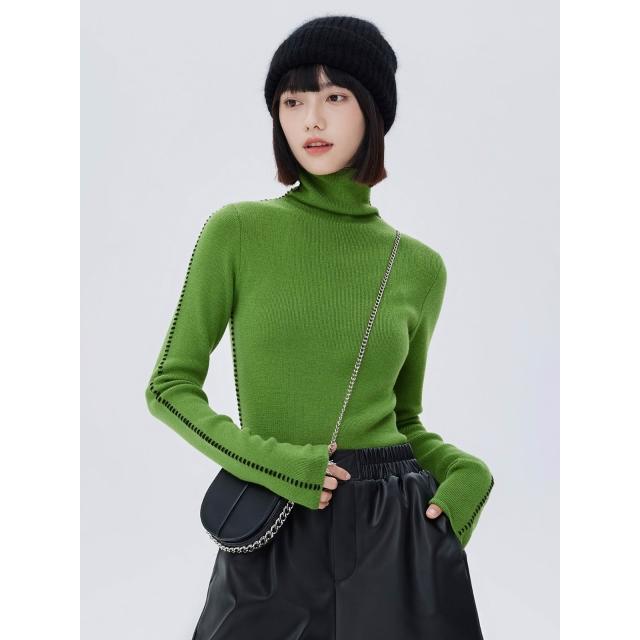 羊毛撞色明線高領針織毛衣2025新款套頭彈力修身長袖綠色毛衣秋冬女
