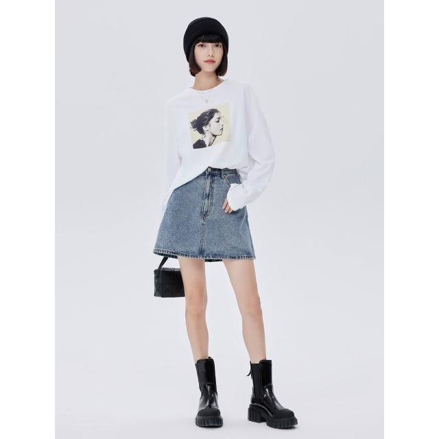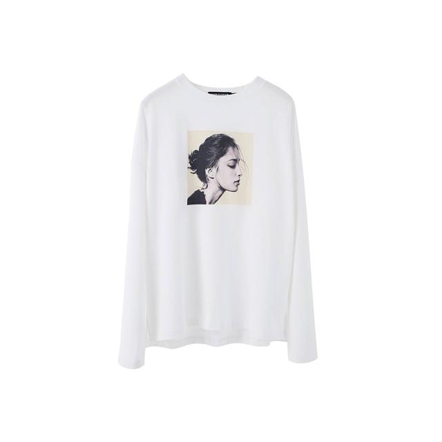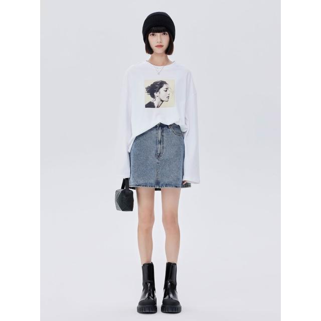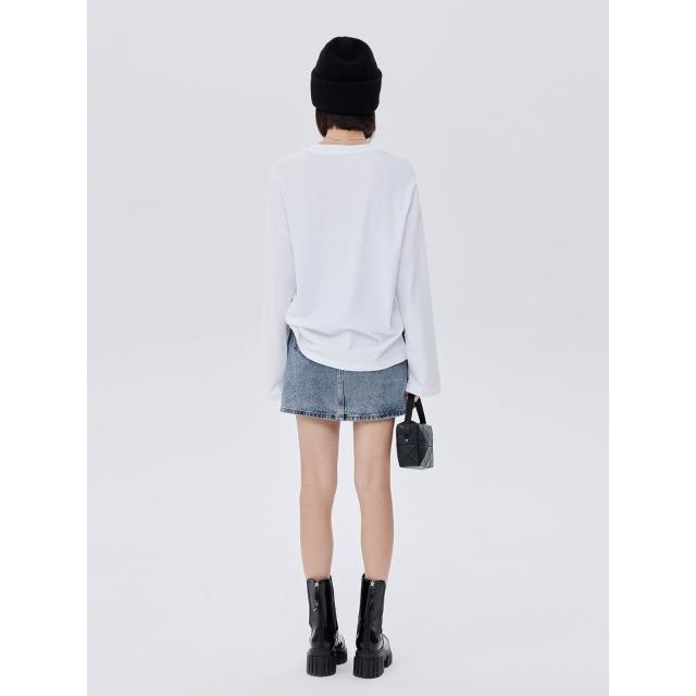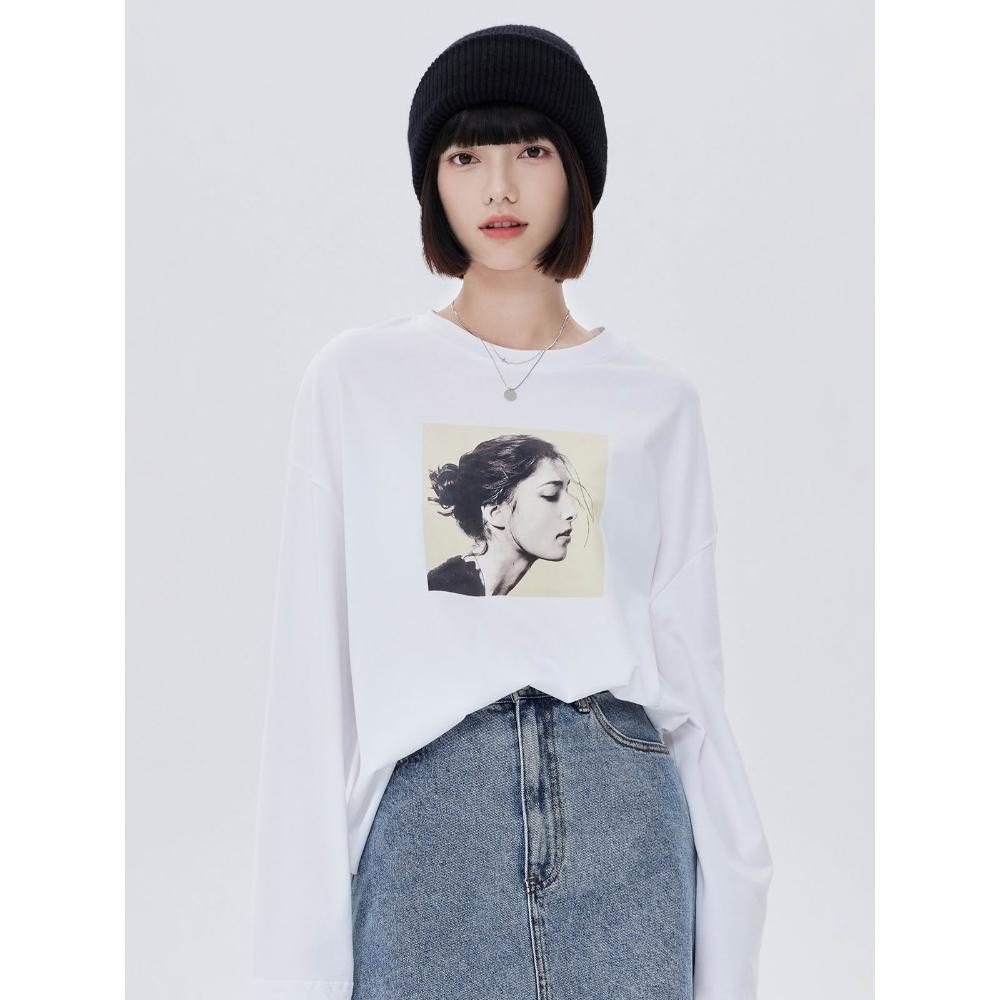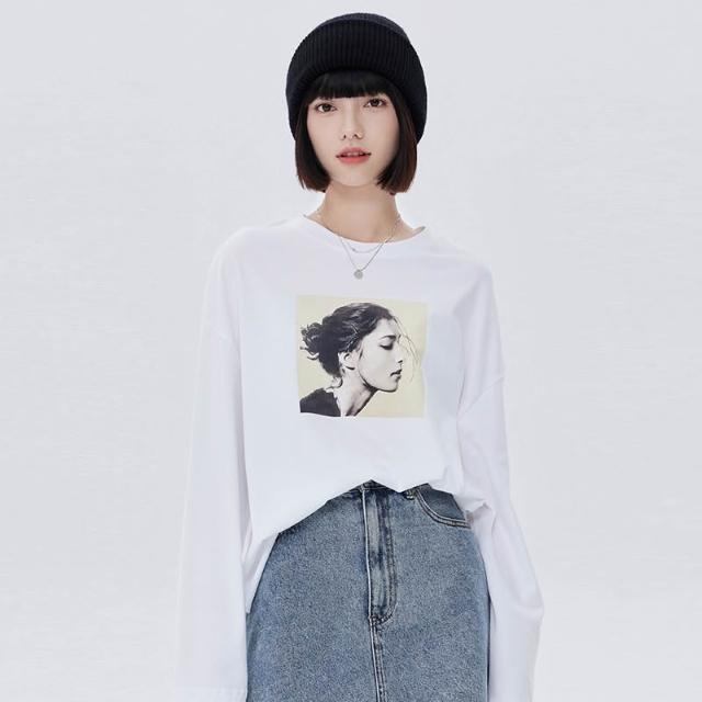 ins風印花圓領內搭上衣2025秋季落肩顯瘦寬鬆白色純棉長袖t恤 女