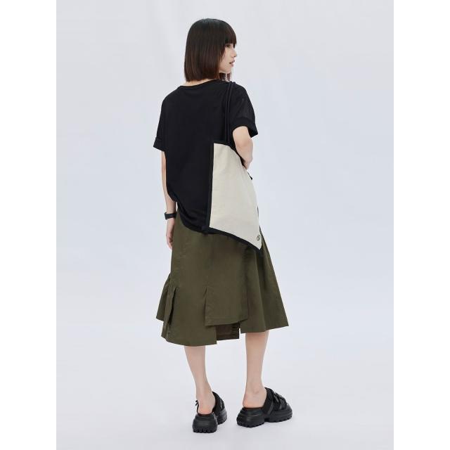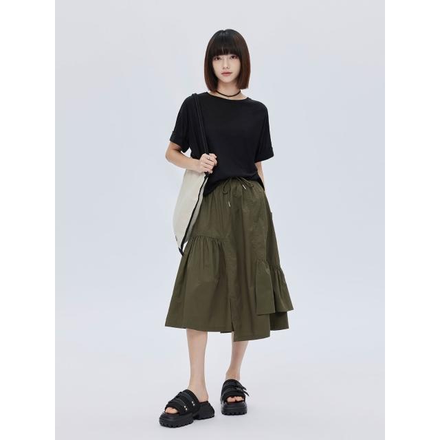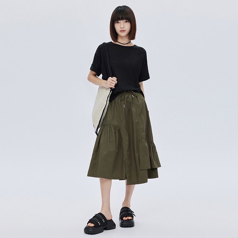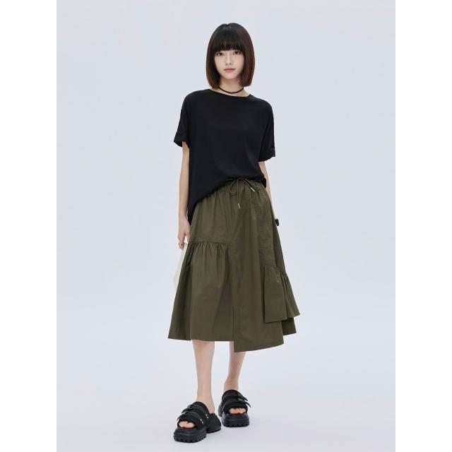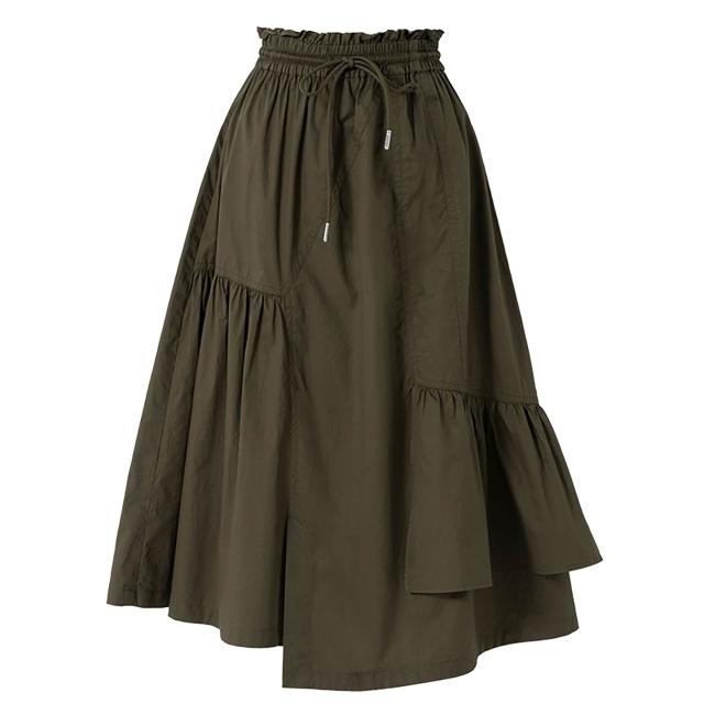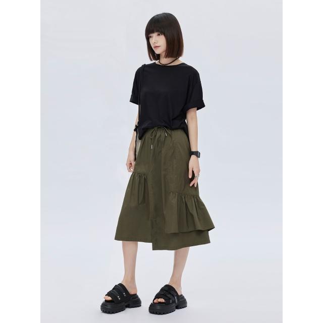 不對稱不規則鬆緊腰抽繩開叉拼接2025夏季中長款高腰軍綠色短裙