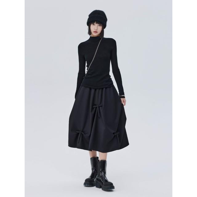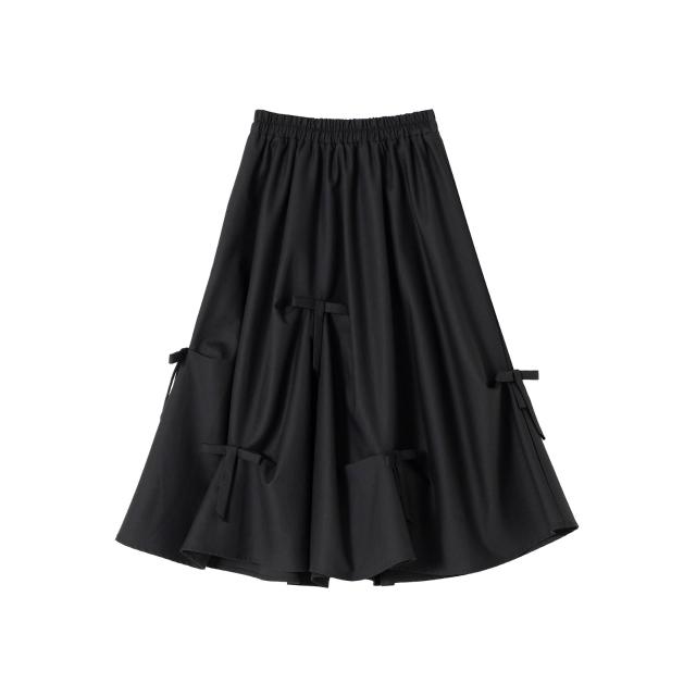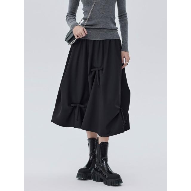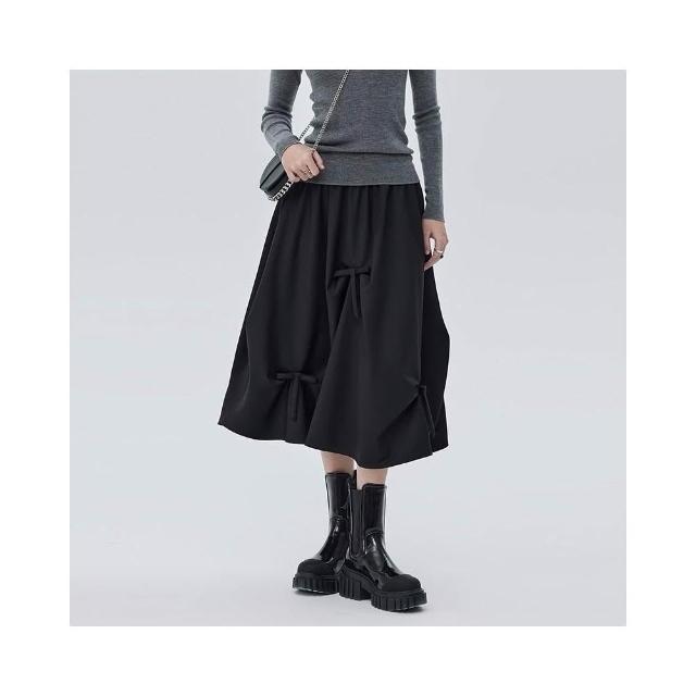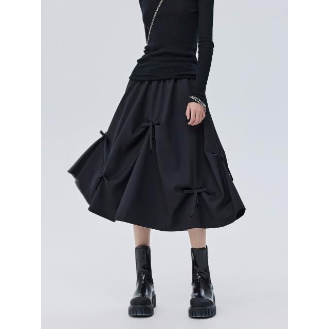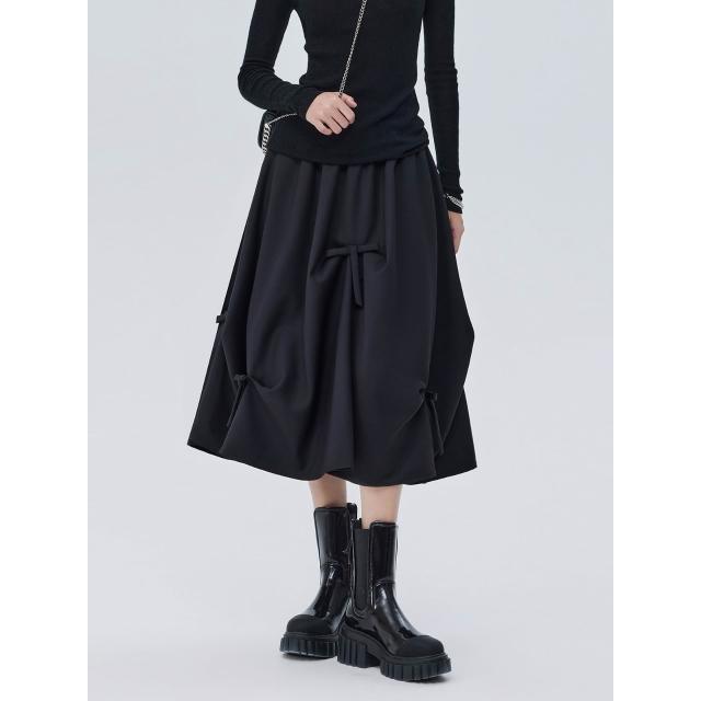 不規則褶皺蝴蝶結傘裙2025新款秋季鬆緊中長款高腰黑色a字短裙