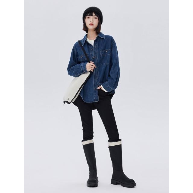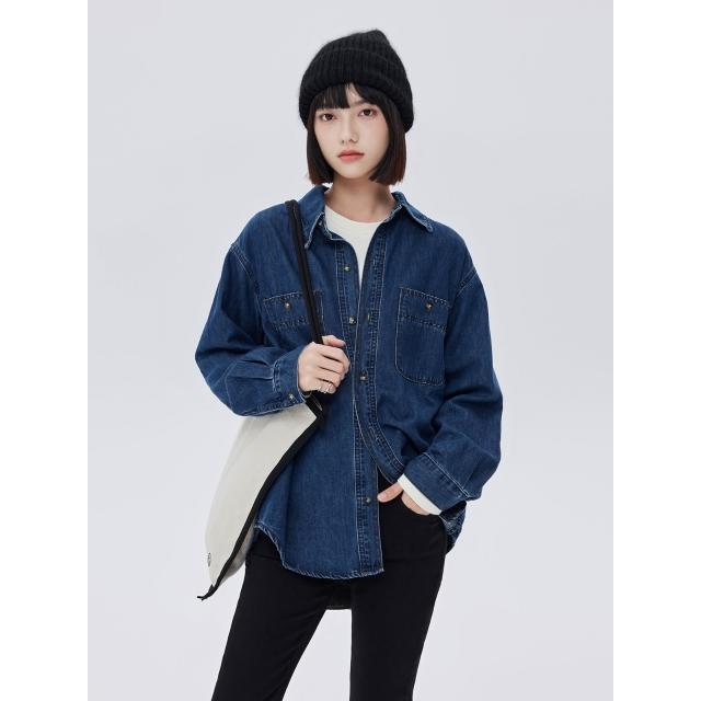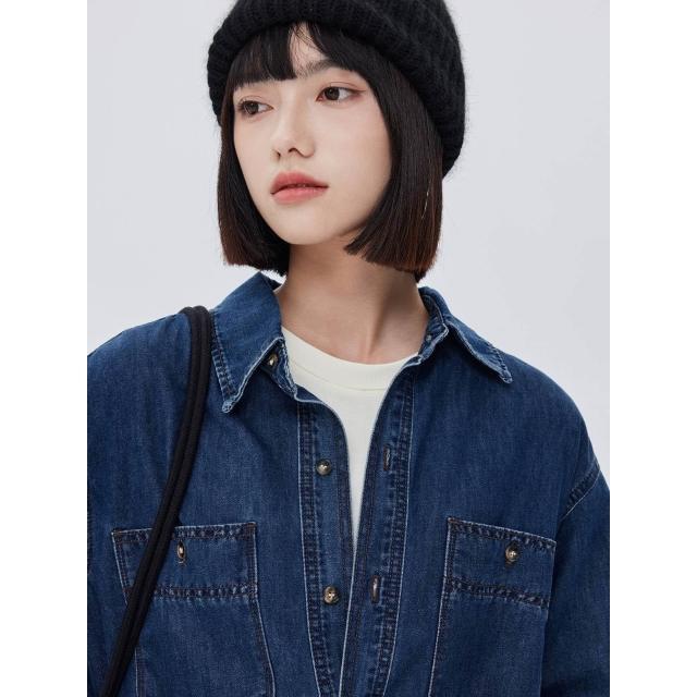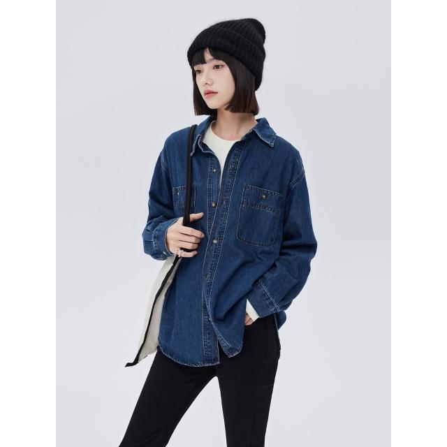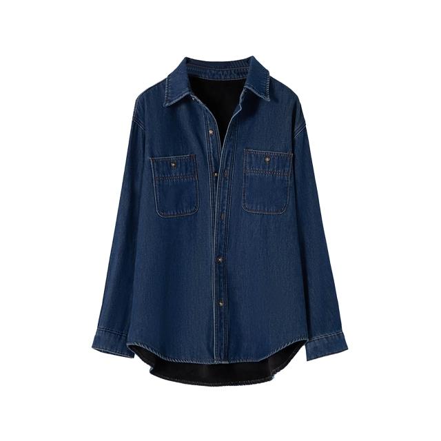 Polo領鈕釦中長款加絨復古寬鬆秋季潮藍色長袖牛仔襯衫女新款2025