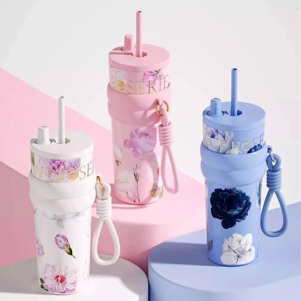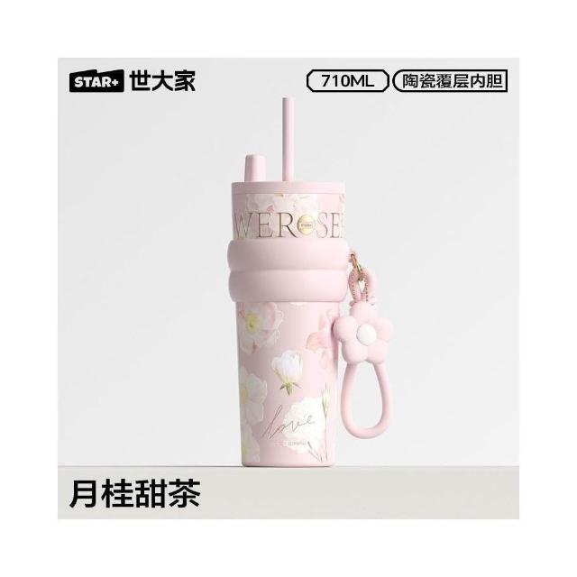 世大家繁花極光保溫杯女生高顏值2025新款710ml大容量316不鏽鋼陶瓷內膽吸管水杯生日禮物保冰杯 珍珠奶茶咖啡杯