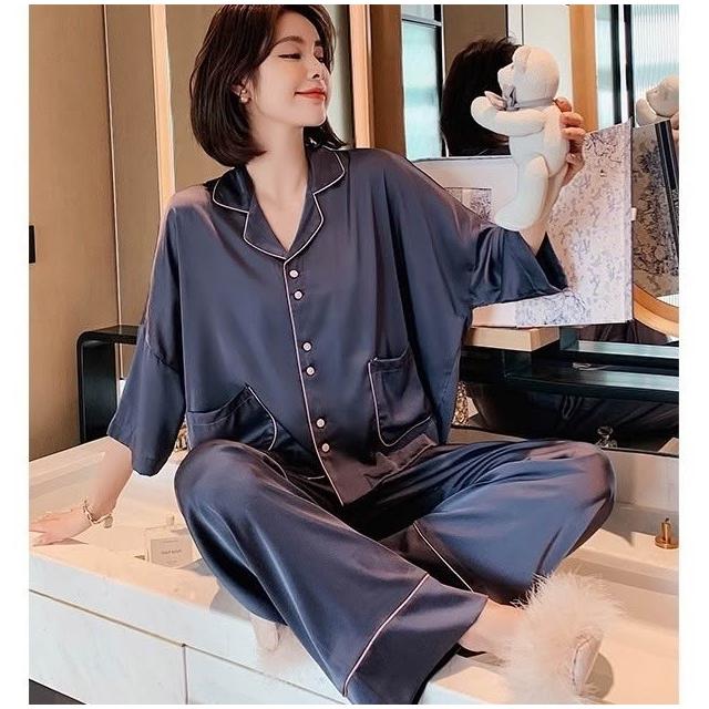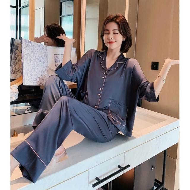 簡約女生睡衣 薄款七分袖 長褲 可外穿 仿真絲 寬鬆居家服 自然春季 家居服 冰絲套裝睡衣 日系韓版