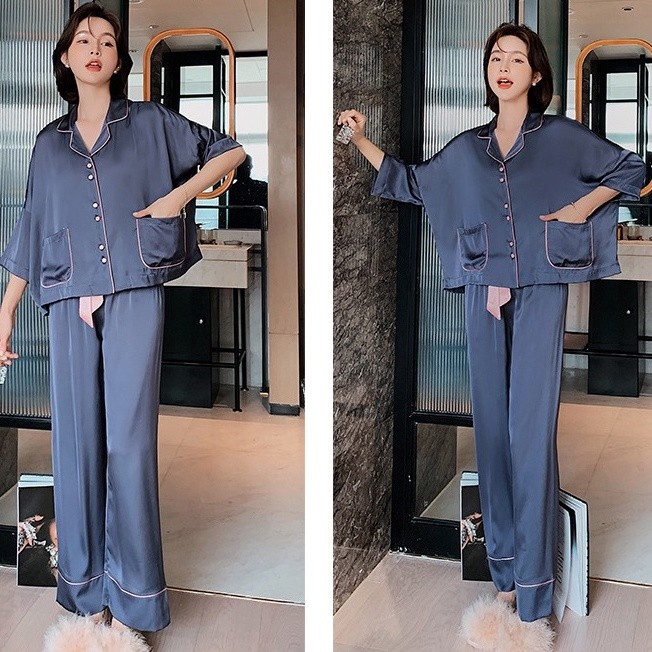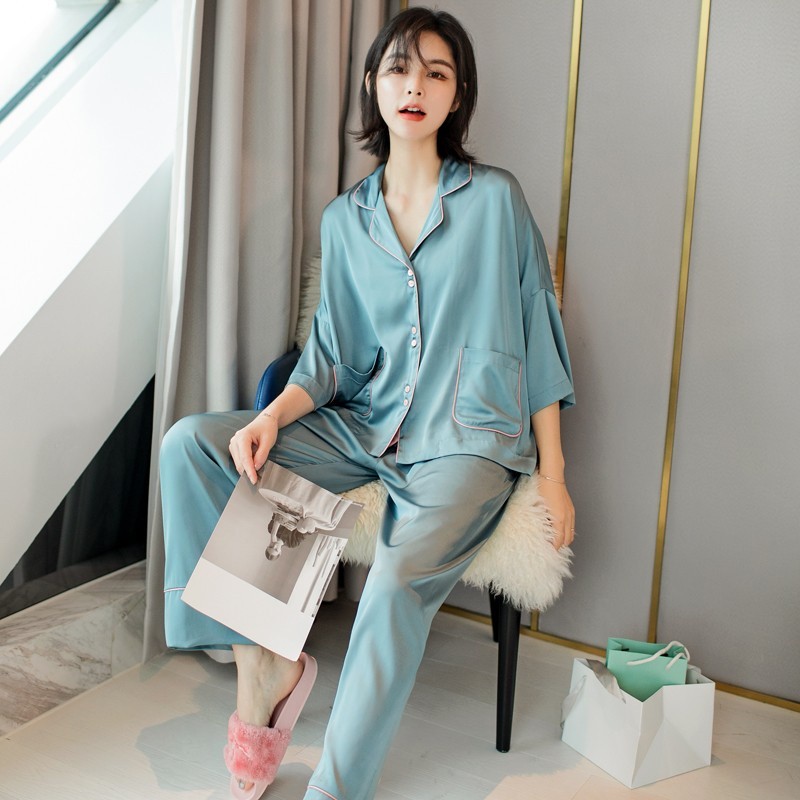 簡約女生睡衣 薄款七分袖 長褲 可外穿 仿真絲 寬鬆居家服 自然春季 家居服 冰絲套裝睡衣 日系韓版