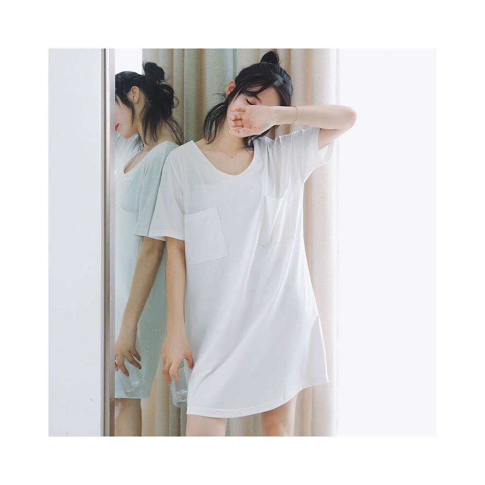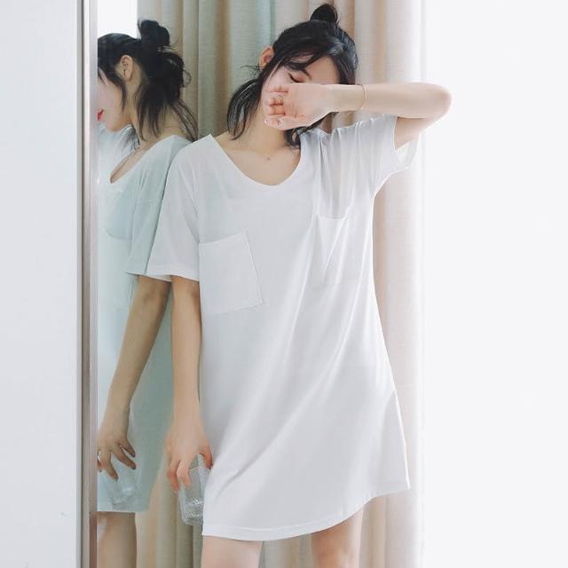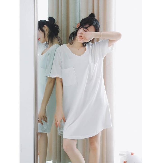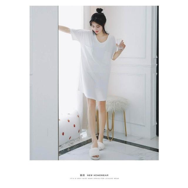台灣❤️ 無印風 簡約純白純棉睡衣 寬鬆白T恤短袖睡裙 性感V領 居家服家居服 中長款睡衣 女生睡衣 北歐風睡衣