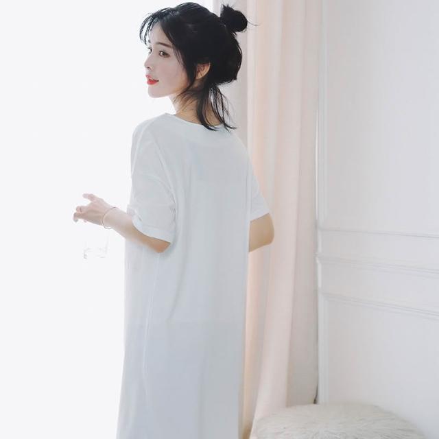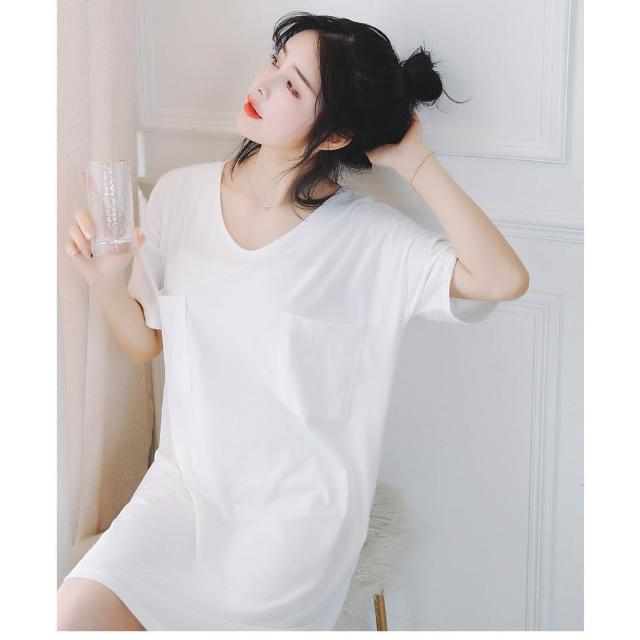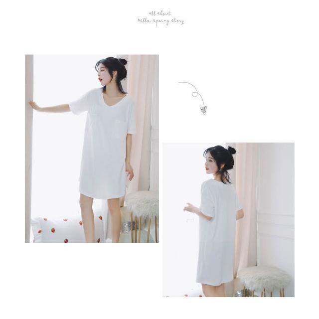 台灣❤️ 無印風 簡約純白純棉睡衣 寬鬆白T恤短袖睡裙 性感V領 居家服家居服 中長款睡衣 女生睡衣 北歐風睡衣