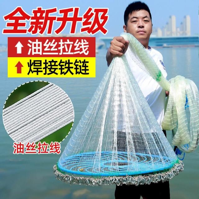 不空军渔具店 大飛盤式油絲拉絲拋網鋼絲拉綫焊接鐵鏈圓盤粗綫魚網撒網捕魚漁網