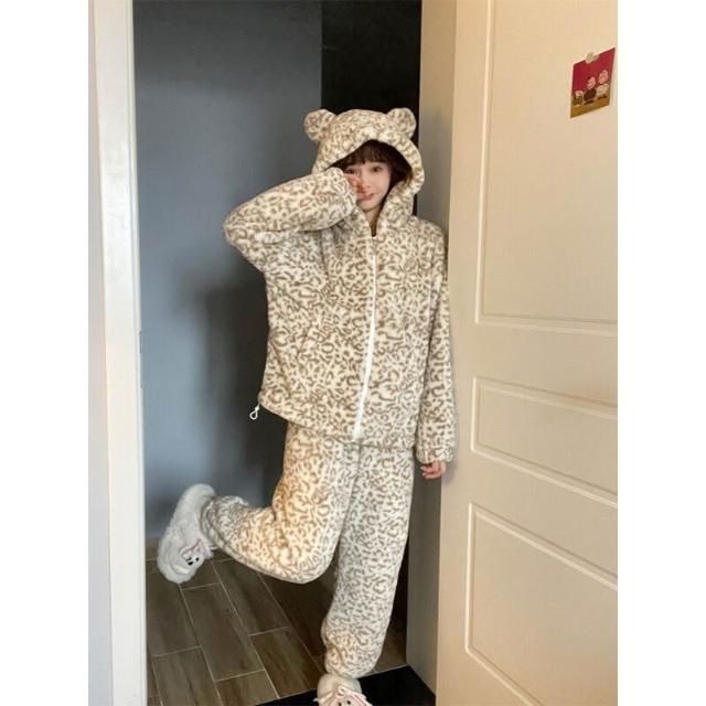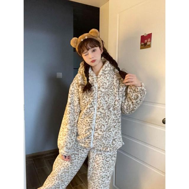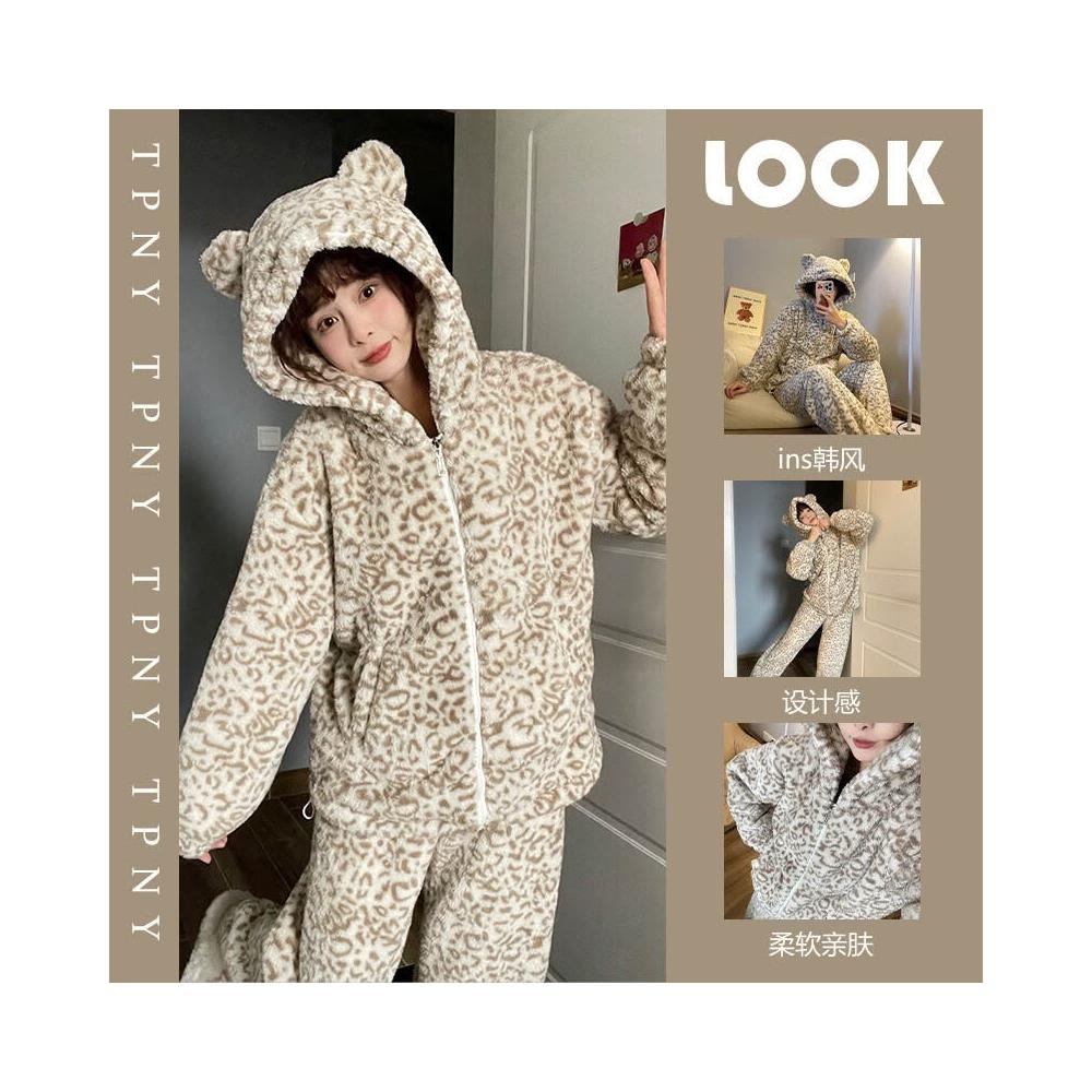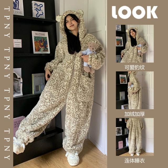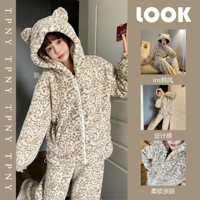 韓版卡通連帽豹紋睡衣女款冬季2023新款加絨加厚毛絨家居服套裝冬