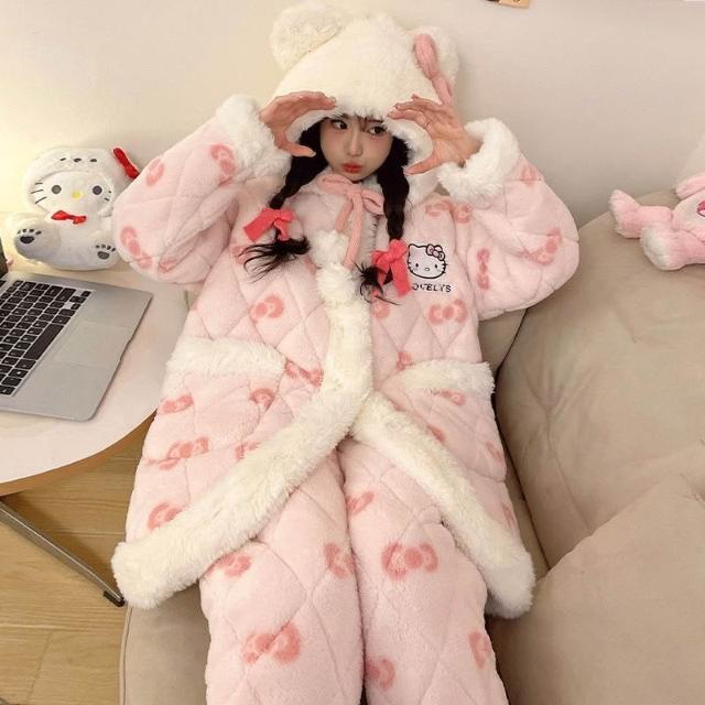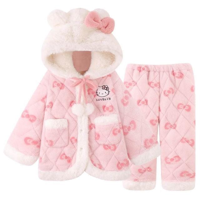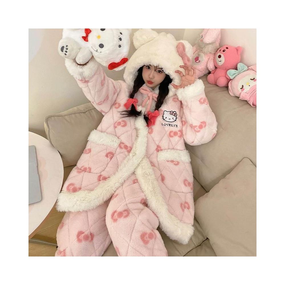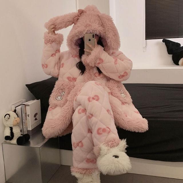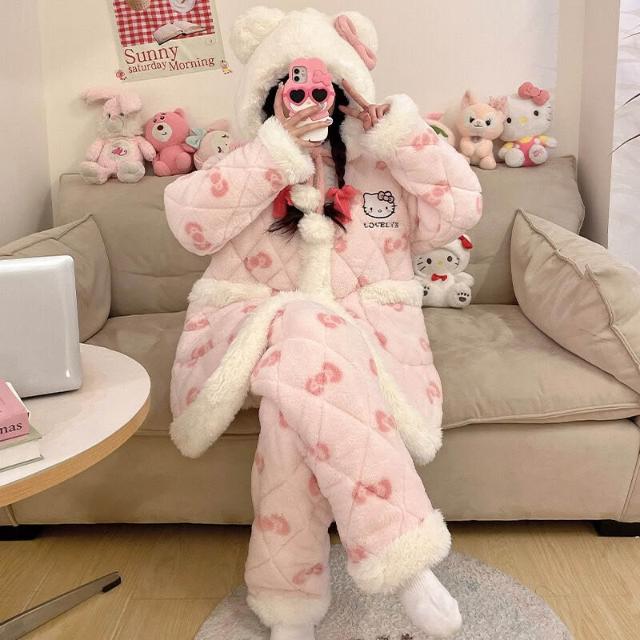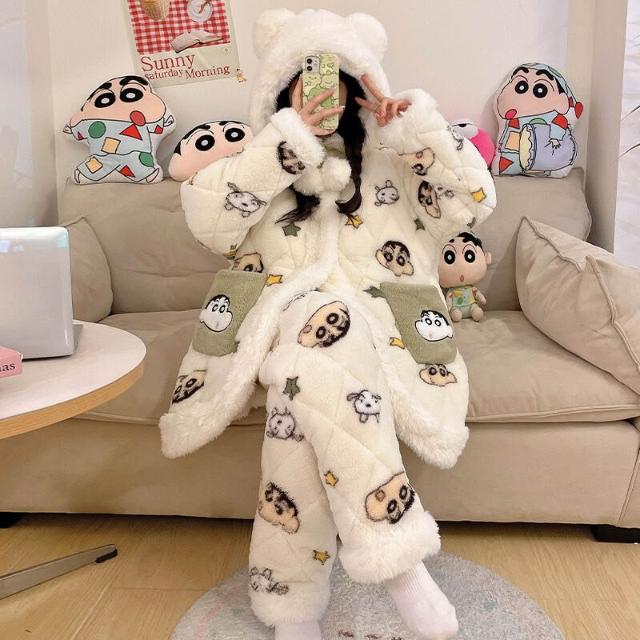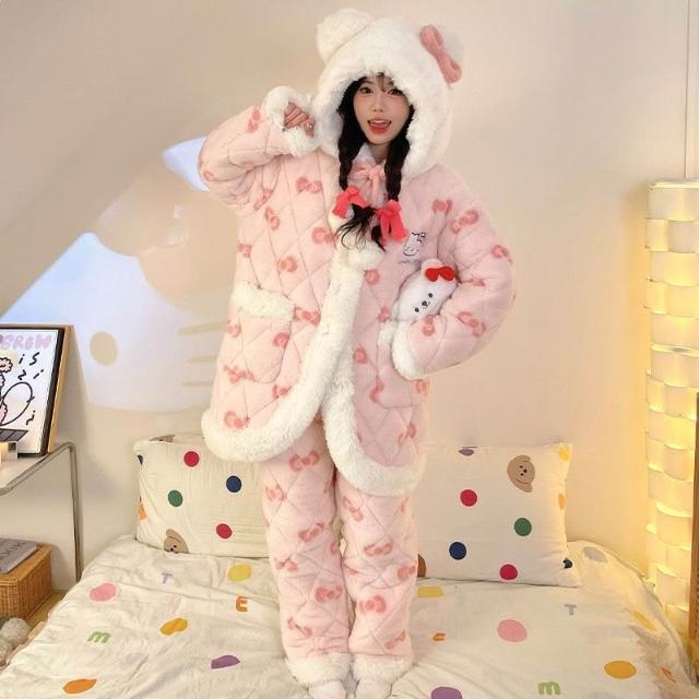 三層夾棉珊瑚絨睡衣女款冬季加絨加厚保暖秋冬款法蘭絨女士家居服