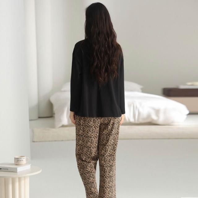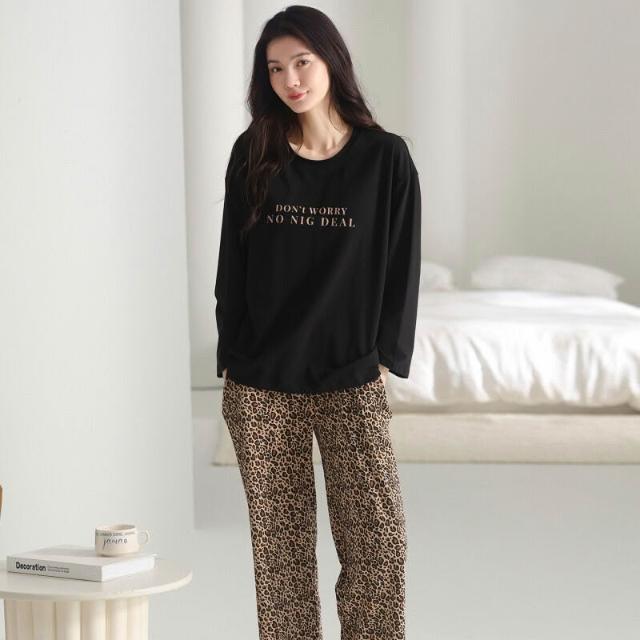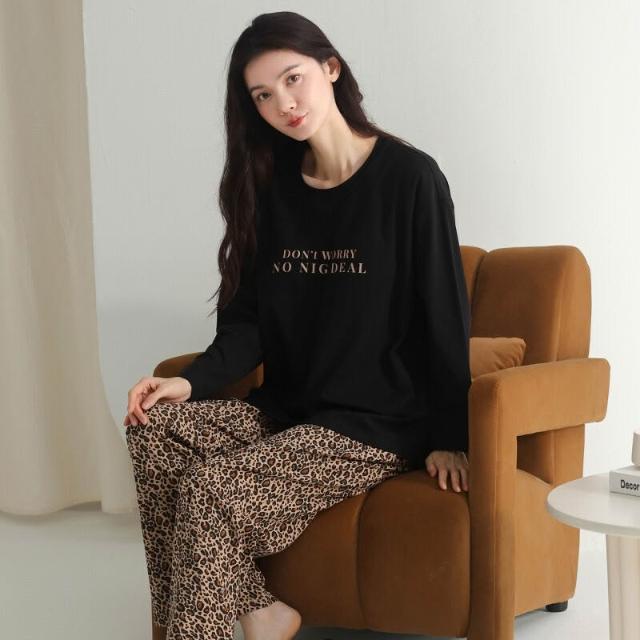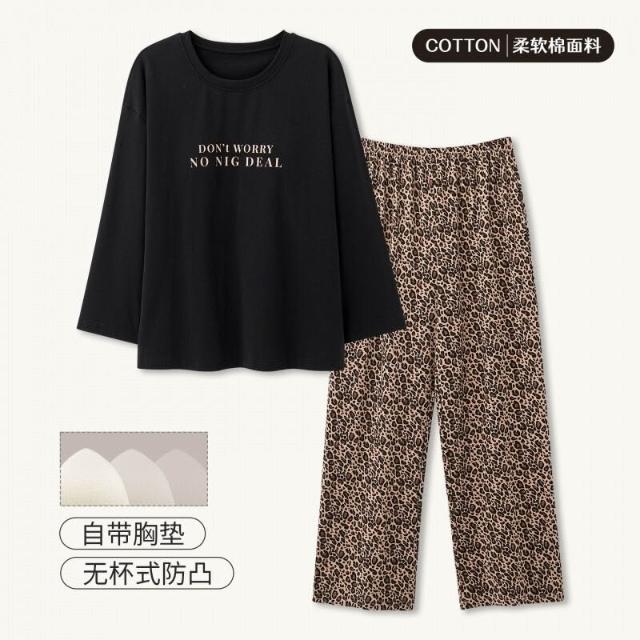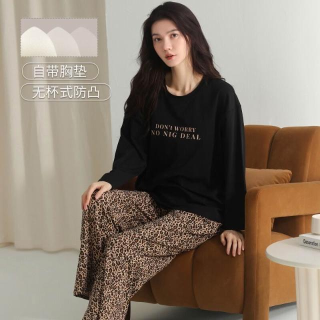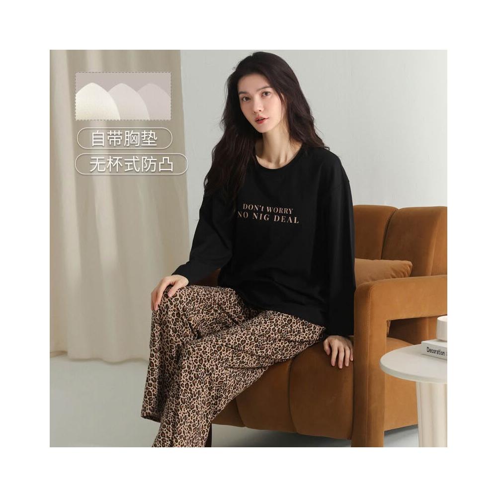 帶胸墊長袖睡衣女春秋季純棉高級感豹紋圓領家居服休閑可外穿套裝