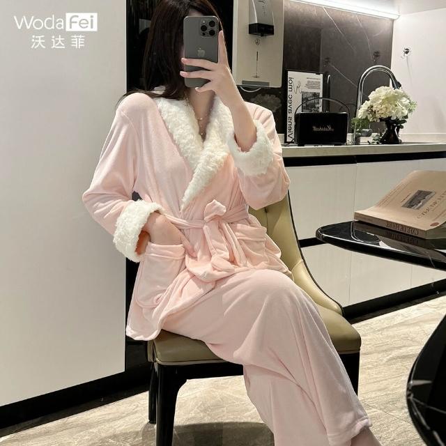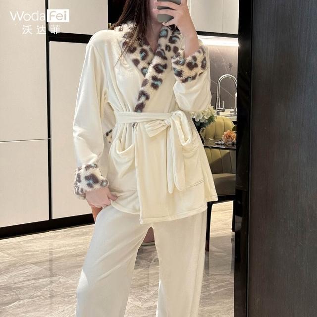 秋冬款豹紋加絨睡衣女高級感海島絨可外穿家居服系帶收腰保暖睡袍
