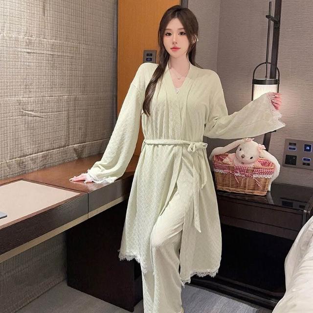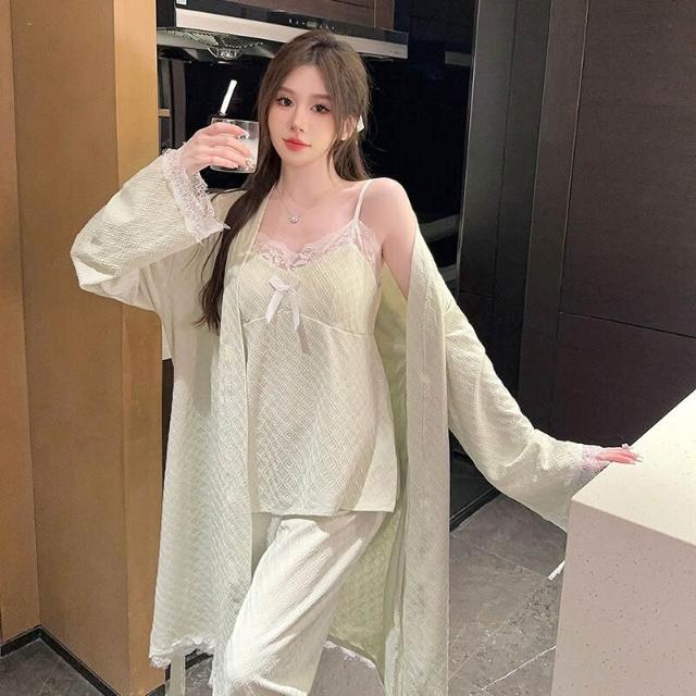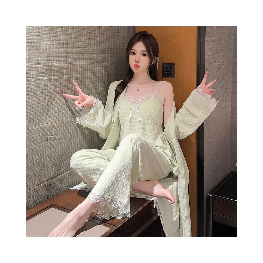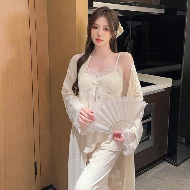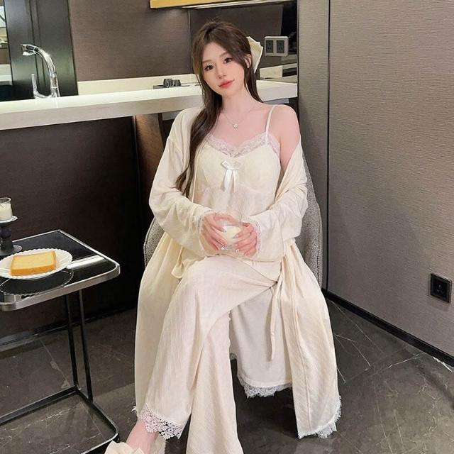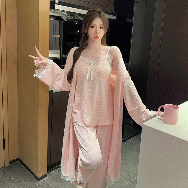 帶胸墊睡衣女款春秋季2025新款純棉性感吊帶睡袍家居服三件套裝