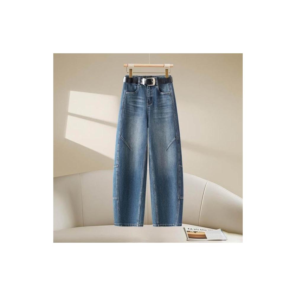 藍色復古顯瘦彎刀牛仔褲 香蕉牛仔褲女 春秋季新款高腰休閒百搭顯瘦闊腿褲 小個子