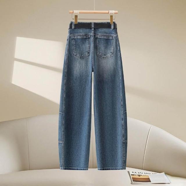 藍色復古顯瘦彎刀牛仔褲 香蕉牛仔褲女 春秋季新款高腰休閒百搭顯瘦闊腿褲 小個子