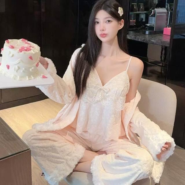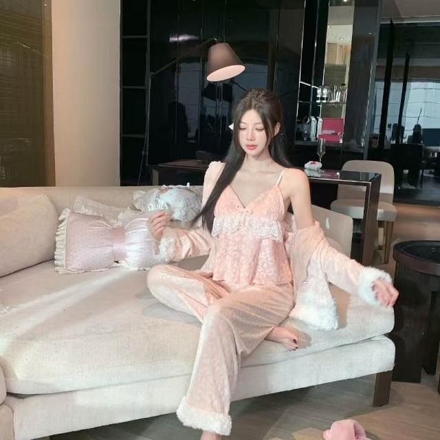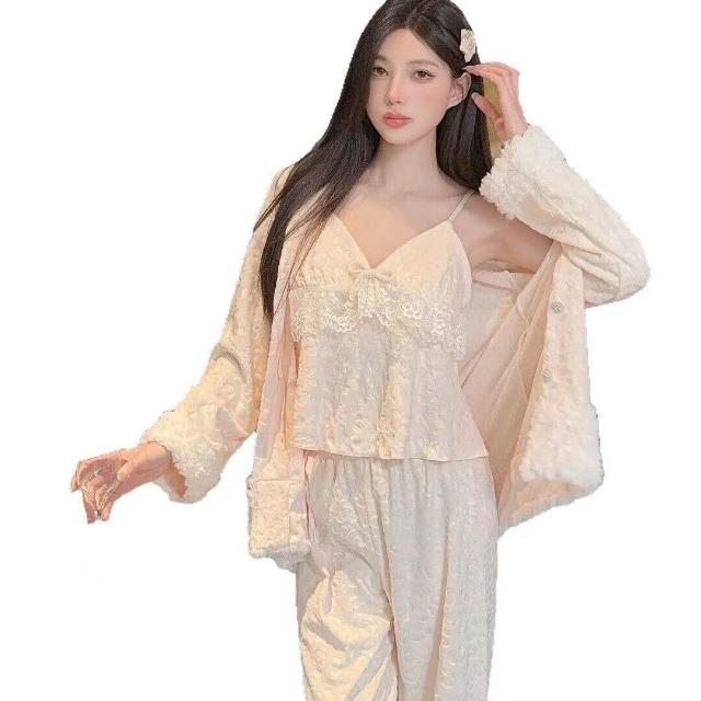海島絨睡衣女秋冬新款雙面絨保暖時尚豹紋套裝家居服可外穿三件套
