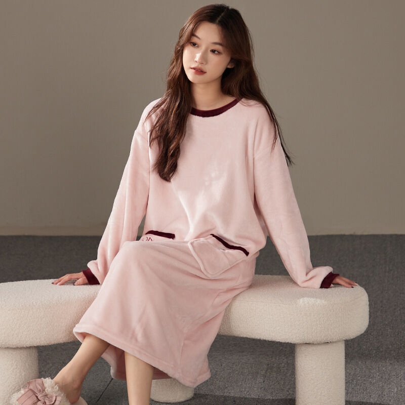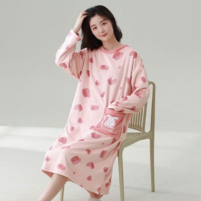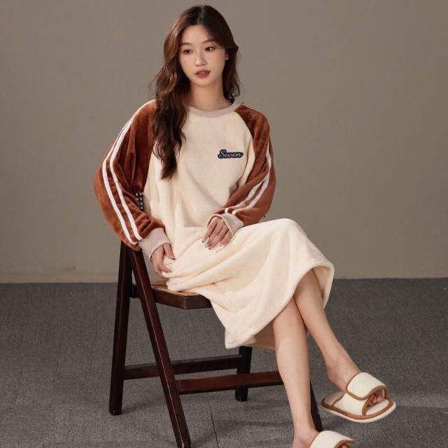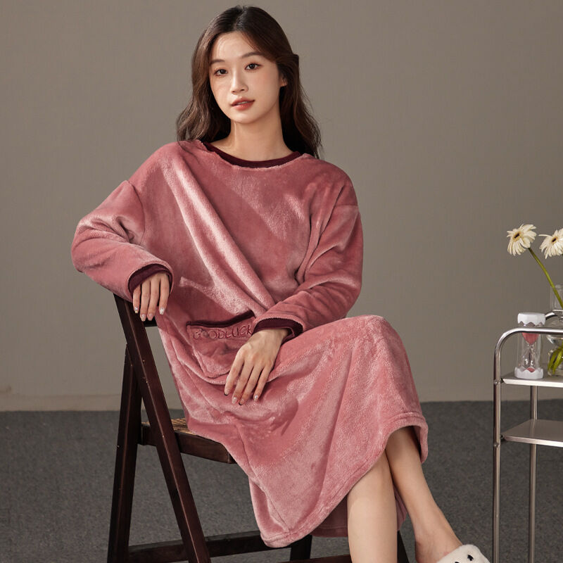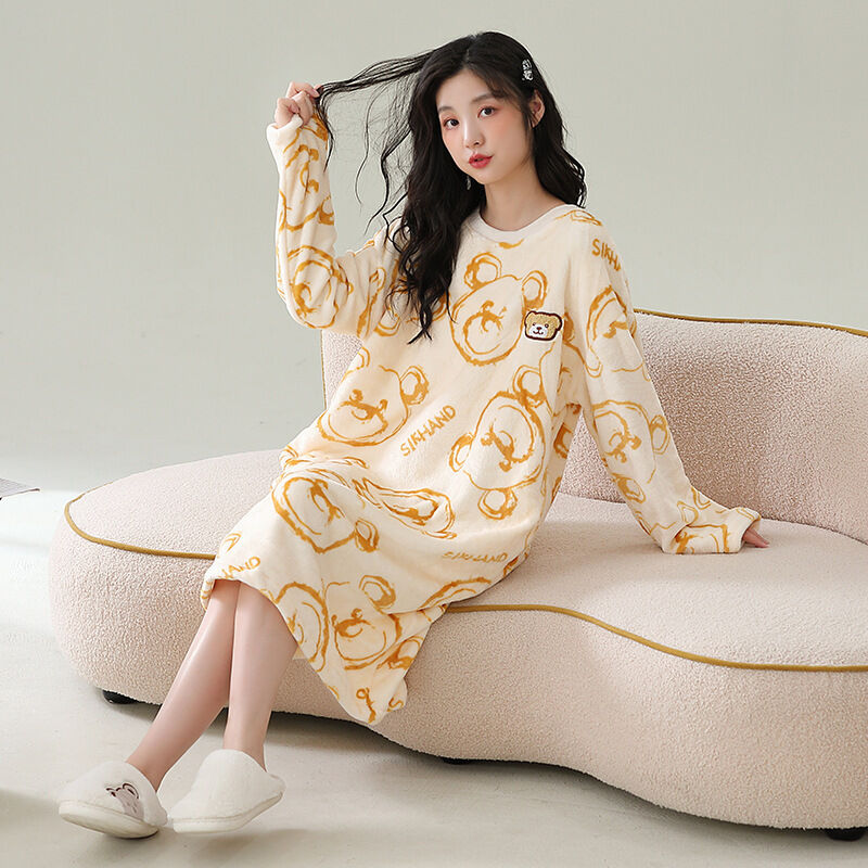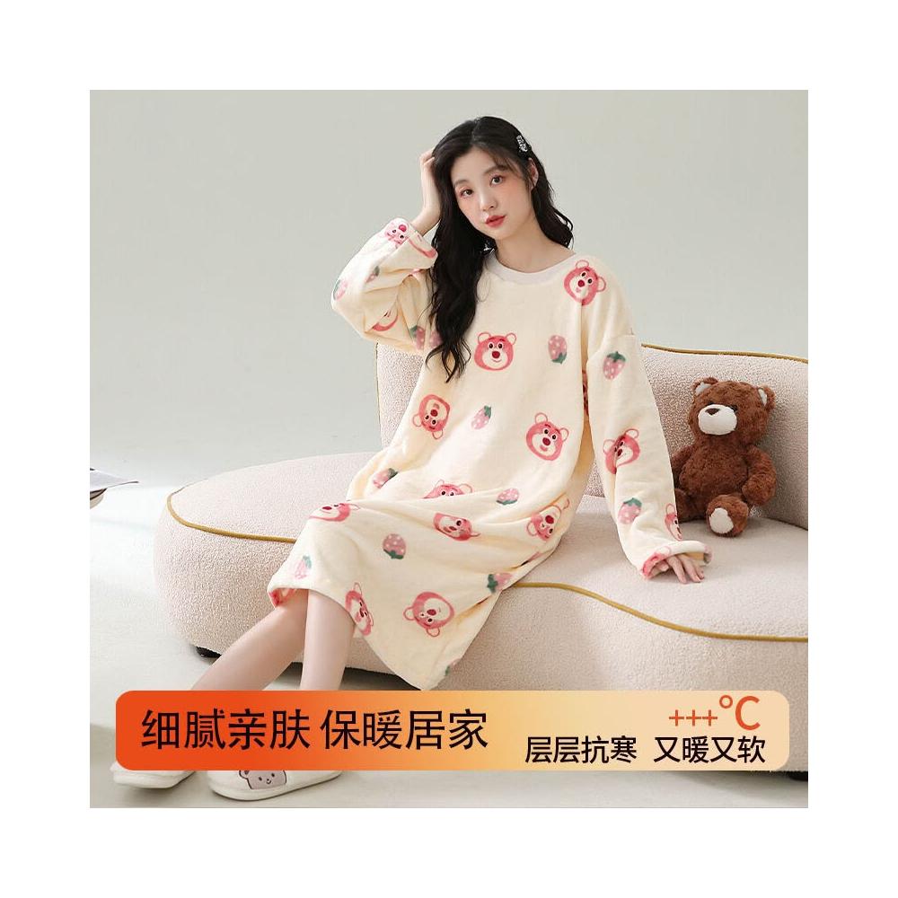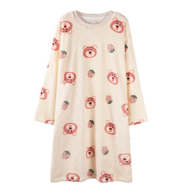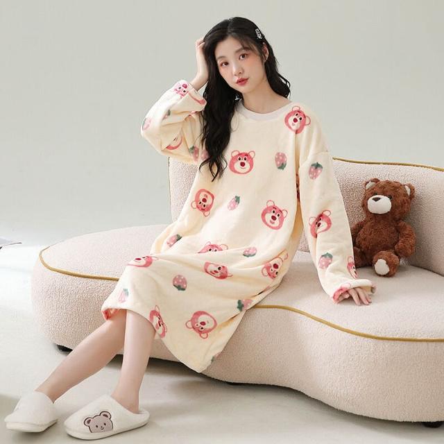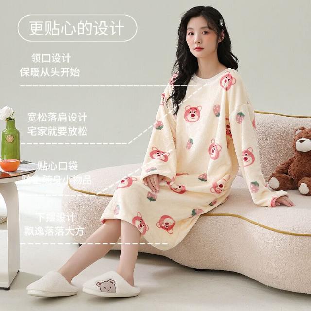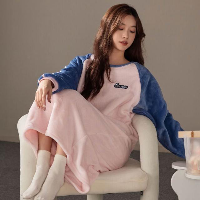 法蘭絨睡衣女冬季珊瑚絨睡裙長袖保暖加絨加厚可外穿連衣裙家居服