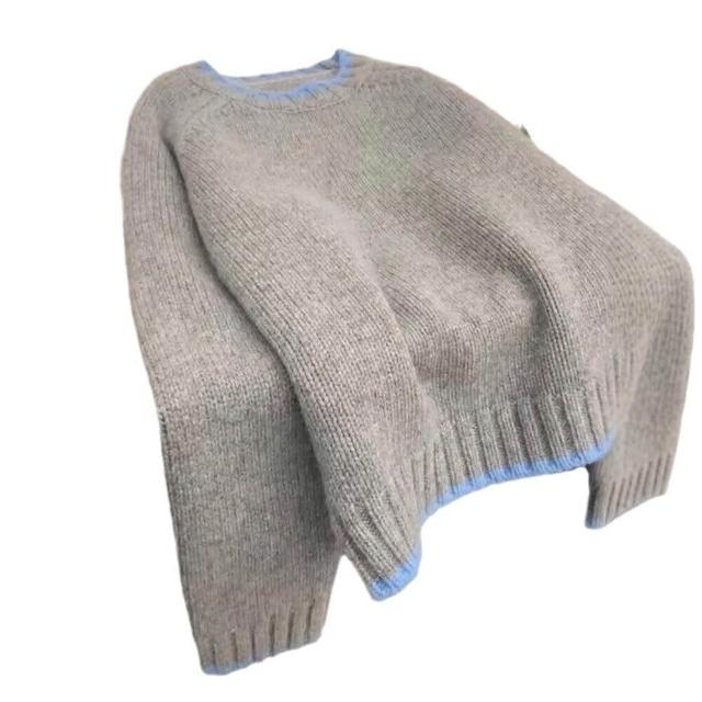 歐貨羊毛衫女秋冬厚寬松軟糯拼色圓領短款羊毛針織打底衫毛衣