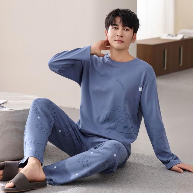 雲溪 睡衣男士春秋款純棉長袖男款純色秋季年新款加大碼秋冬家居服